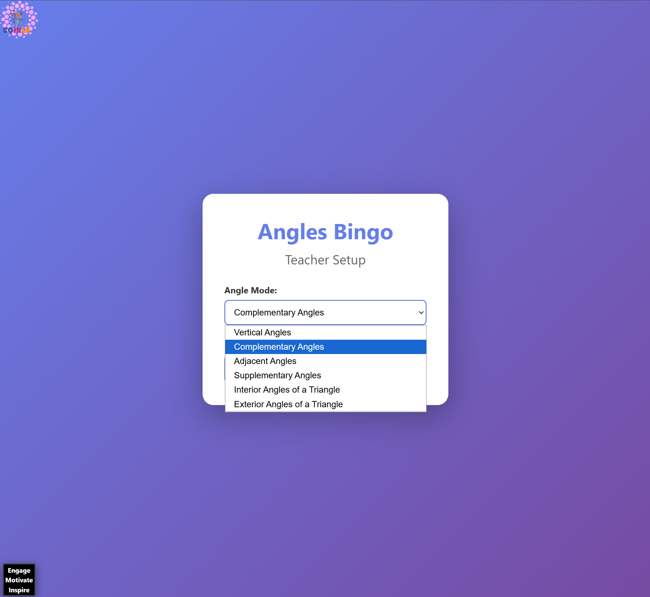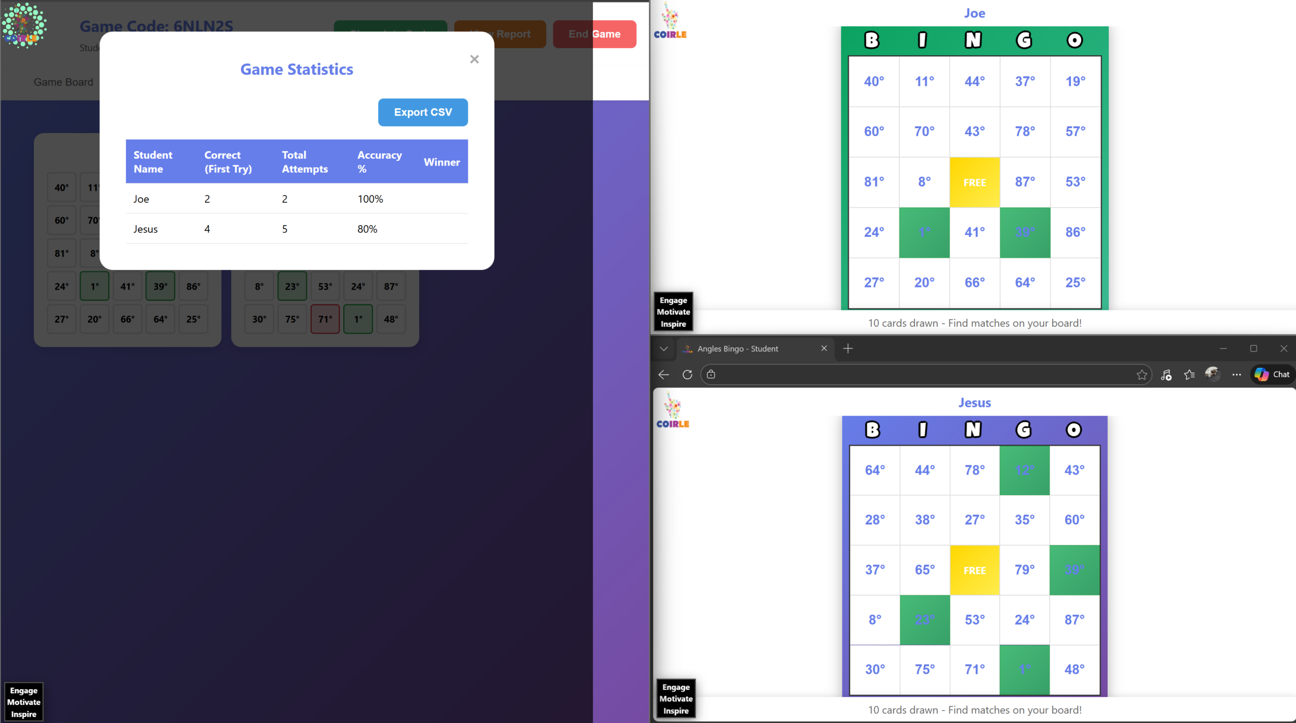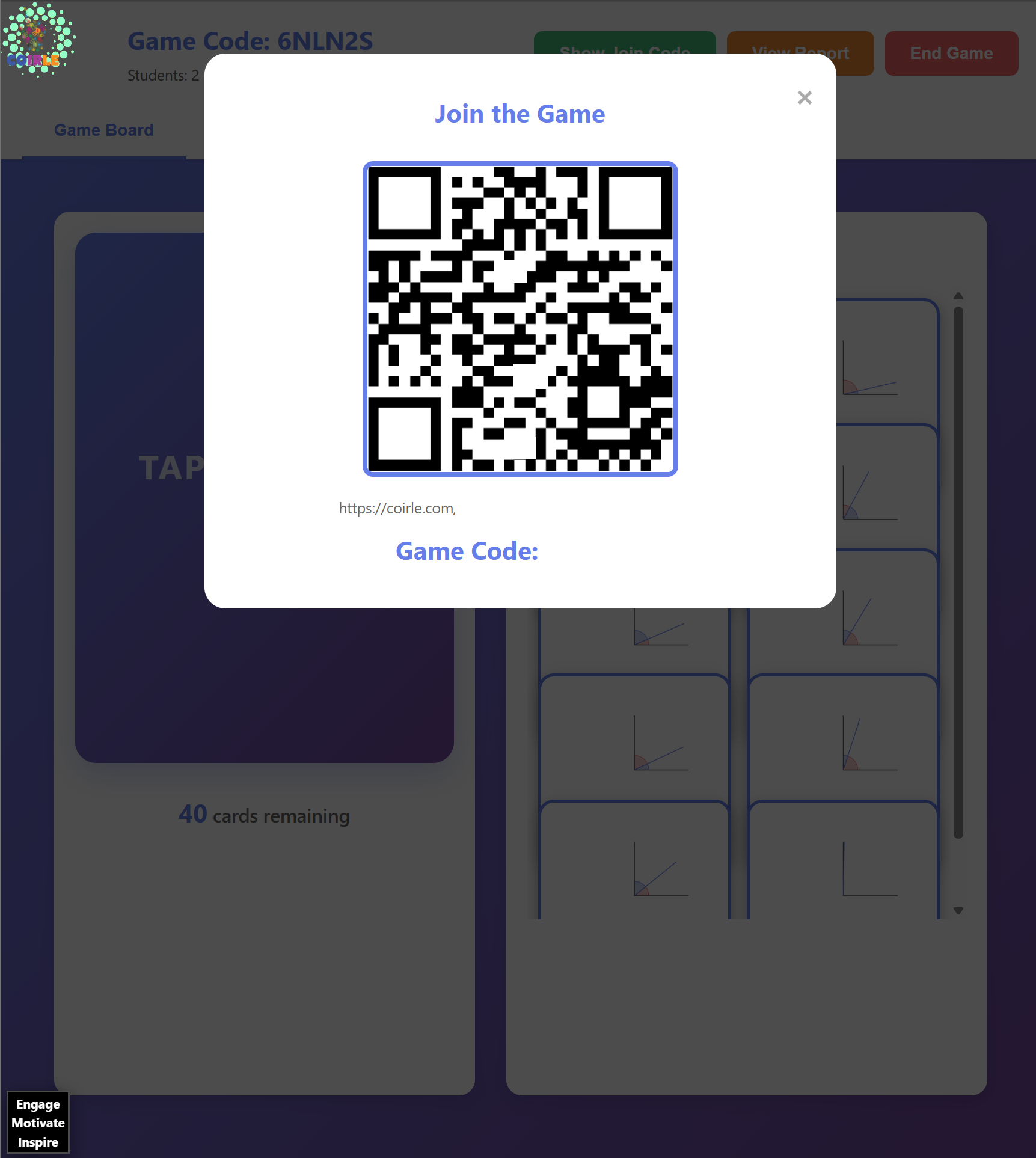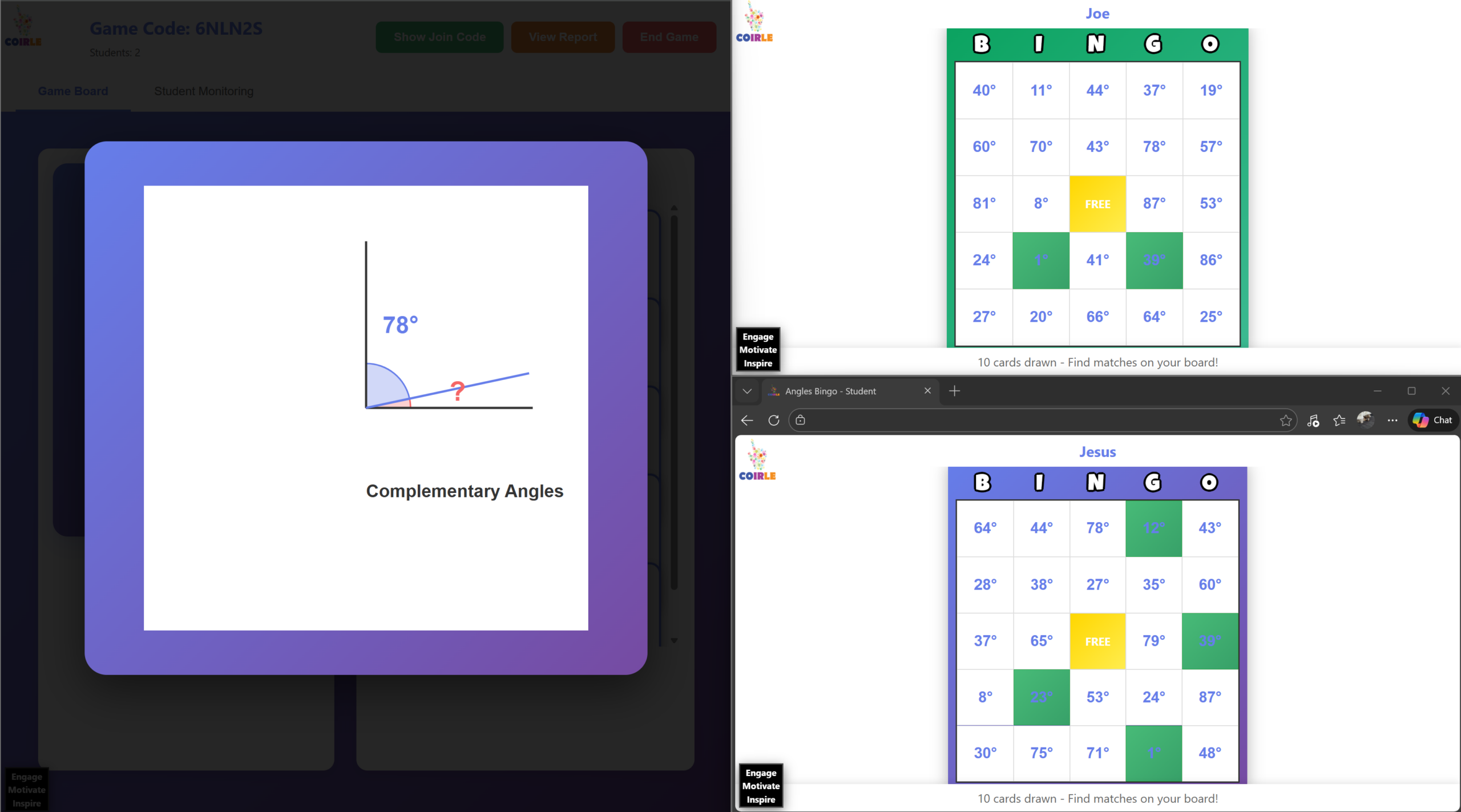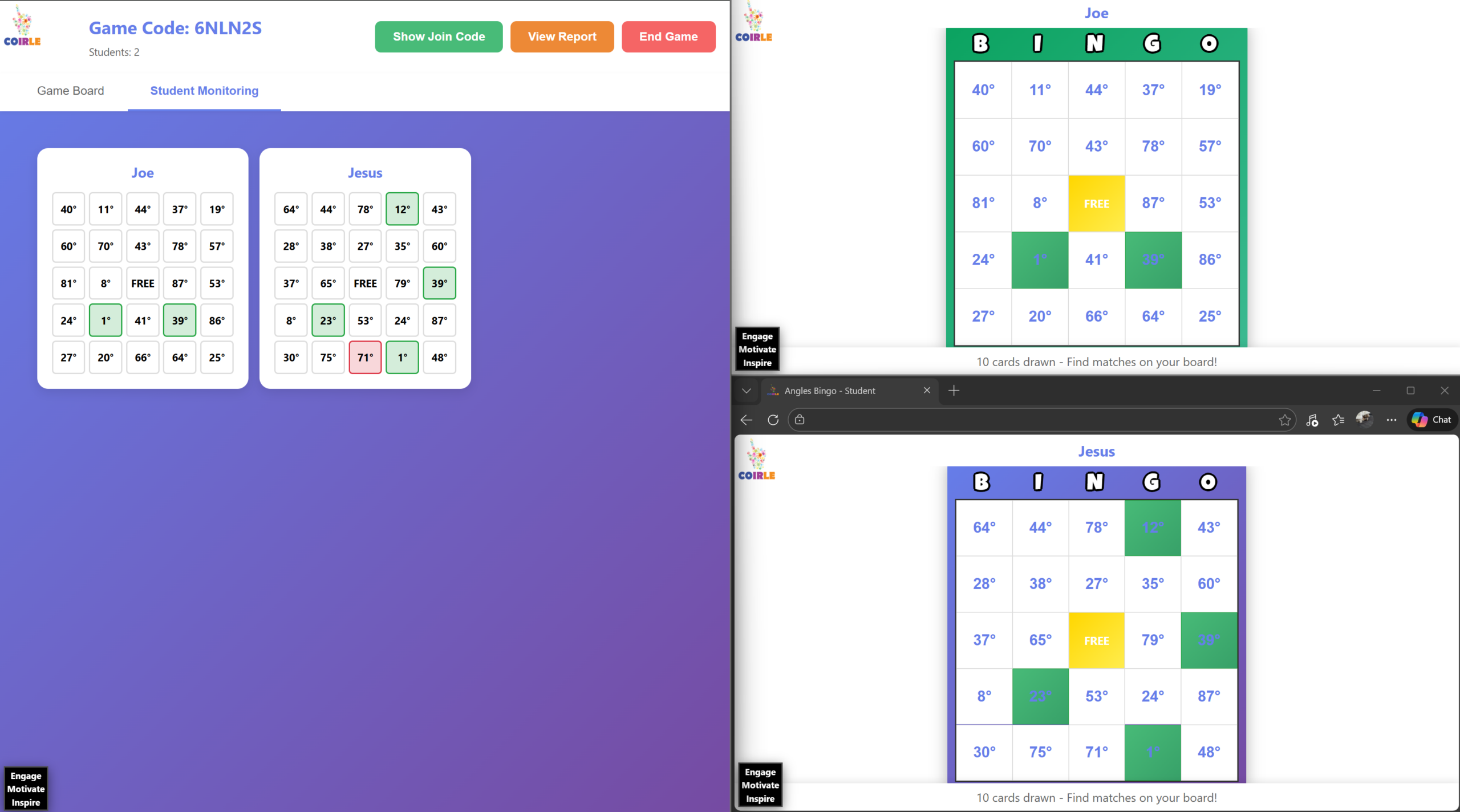 – Students go to: `coirle.com/games/studentbingo/?code=XXXXX`