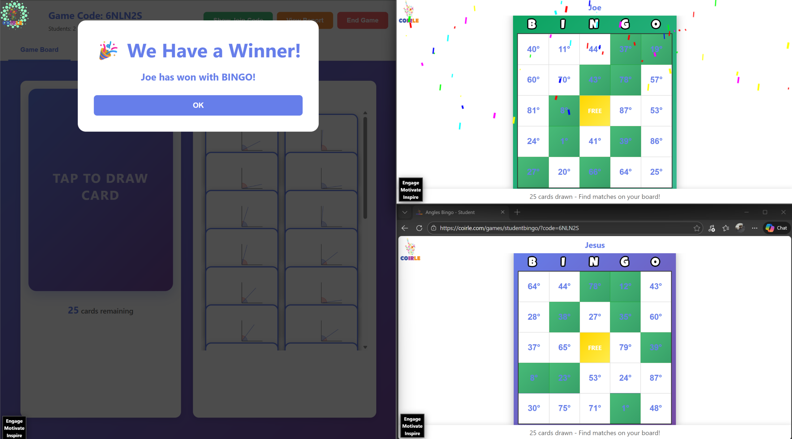 – Winner notification appears automatically when a student gets BINGO