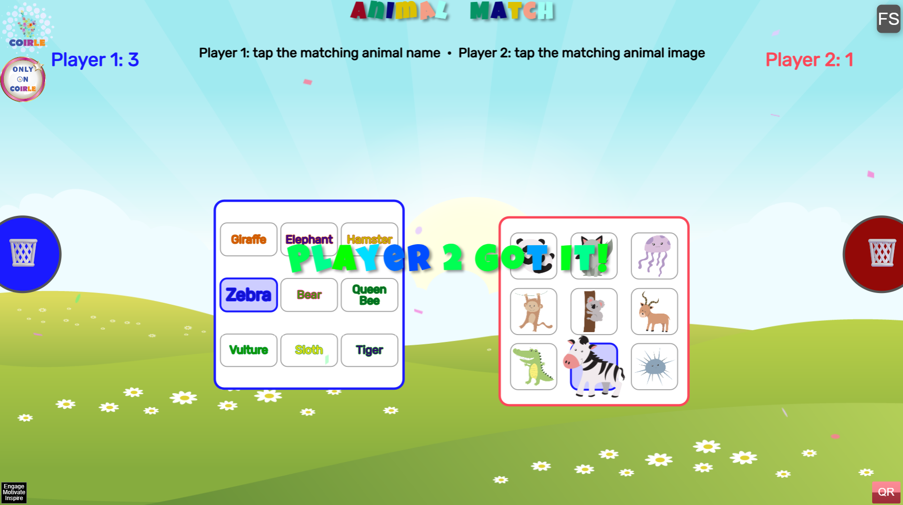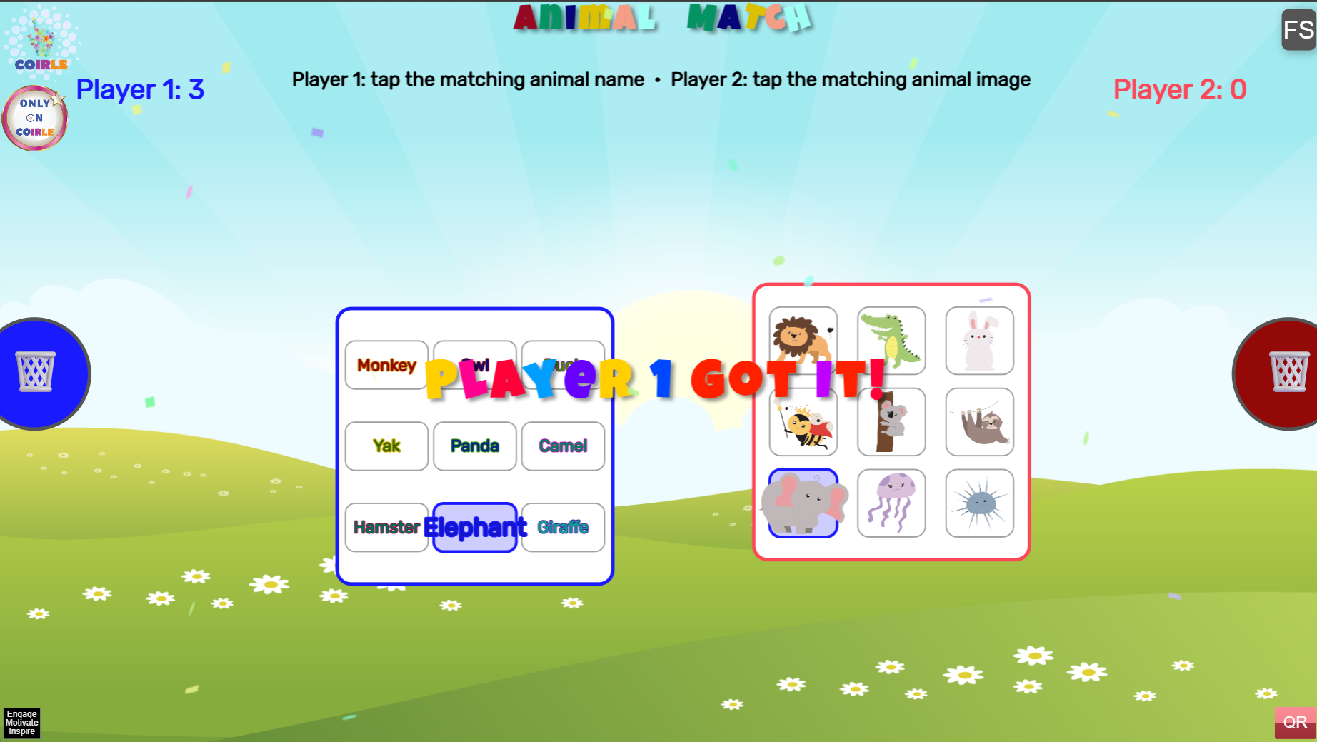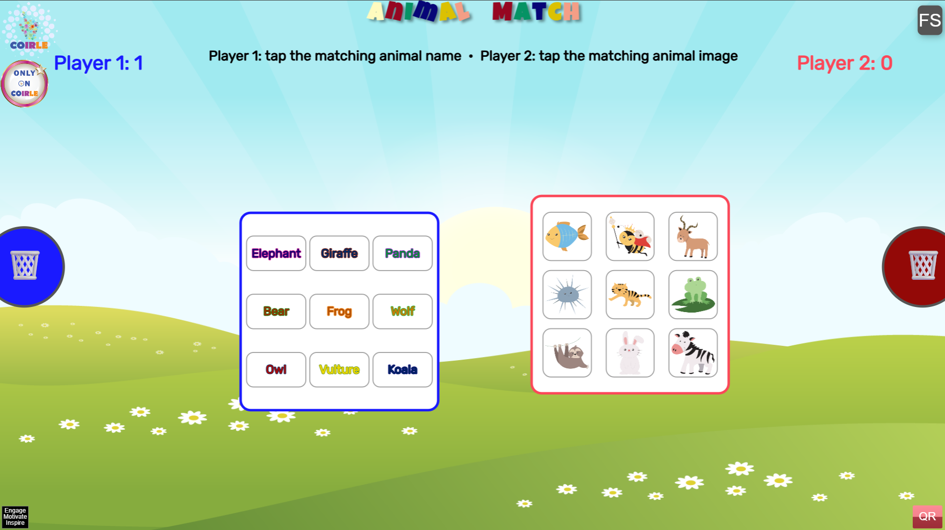 Animal Match is a 2-player head-to-head race to find the one matching pair across two cards. Player 1 gets a grid of animal names, Player 2 gets a grid of animal images. Every round, there is exactly one name on Player 1’s card that matches one image on Player 2’s card. Both players scan their own card and tap their matching item as fast as they can. Whoever taps correctly first wins the round and earns a point. First player to 10 points wins the game.