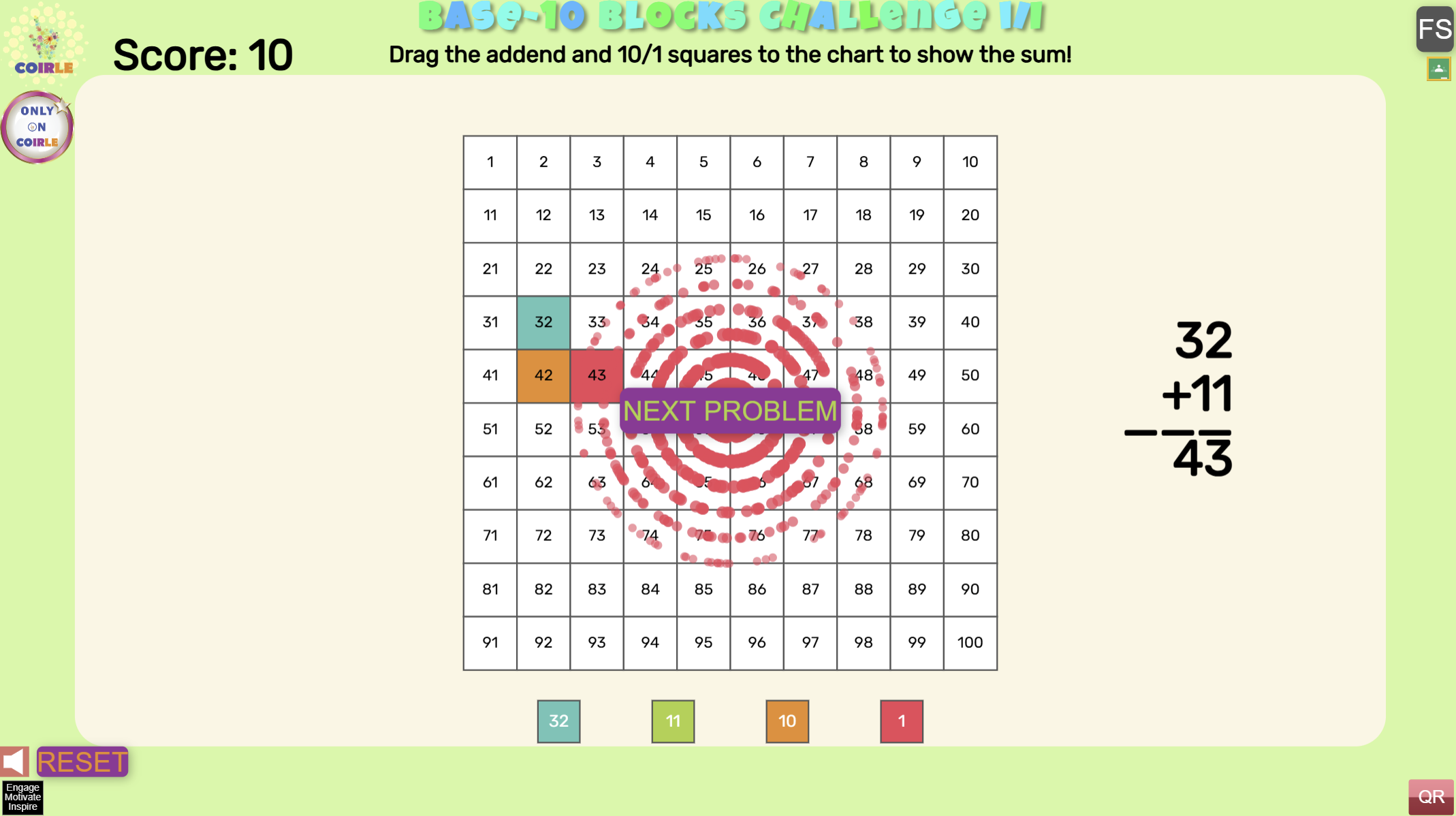 Levels 1-3 (100s Chart Mode): Drag colored squares representing addends, tens, and ones onto a 100-number chart to build addition problems step-by-step, helping students visualize how numbers combine.