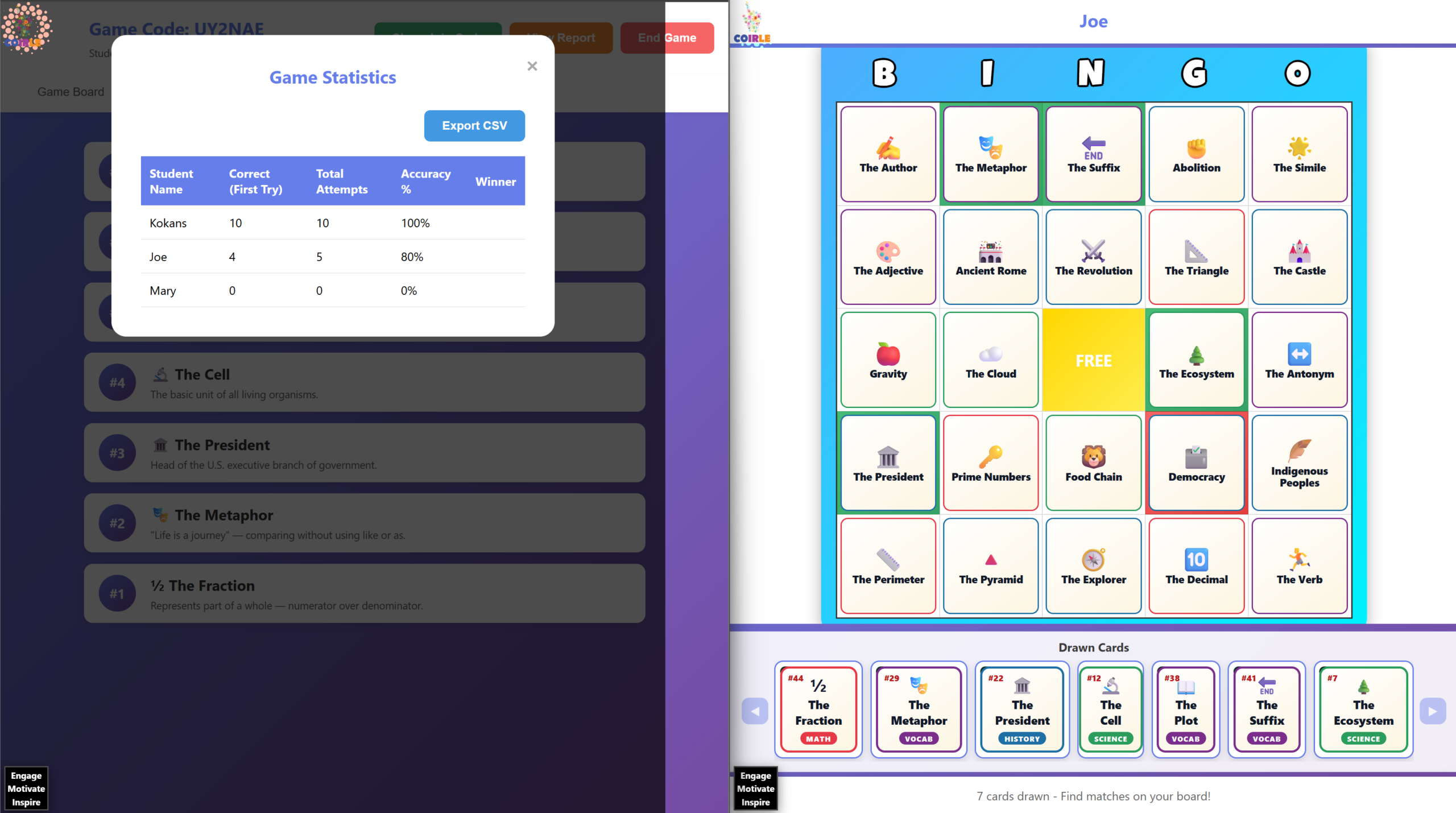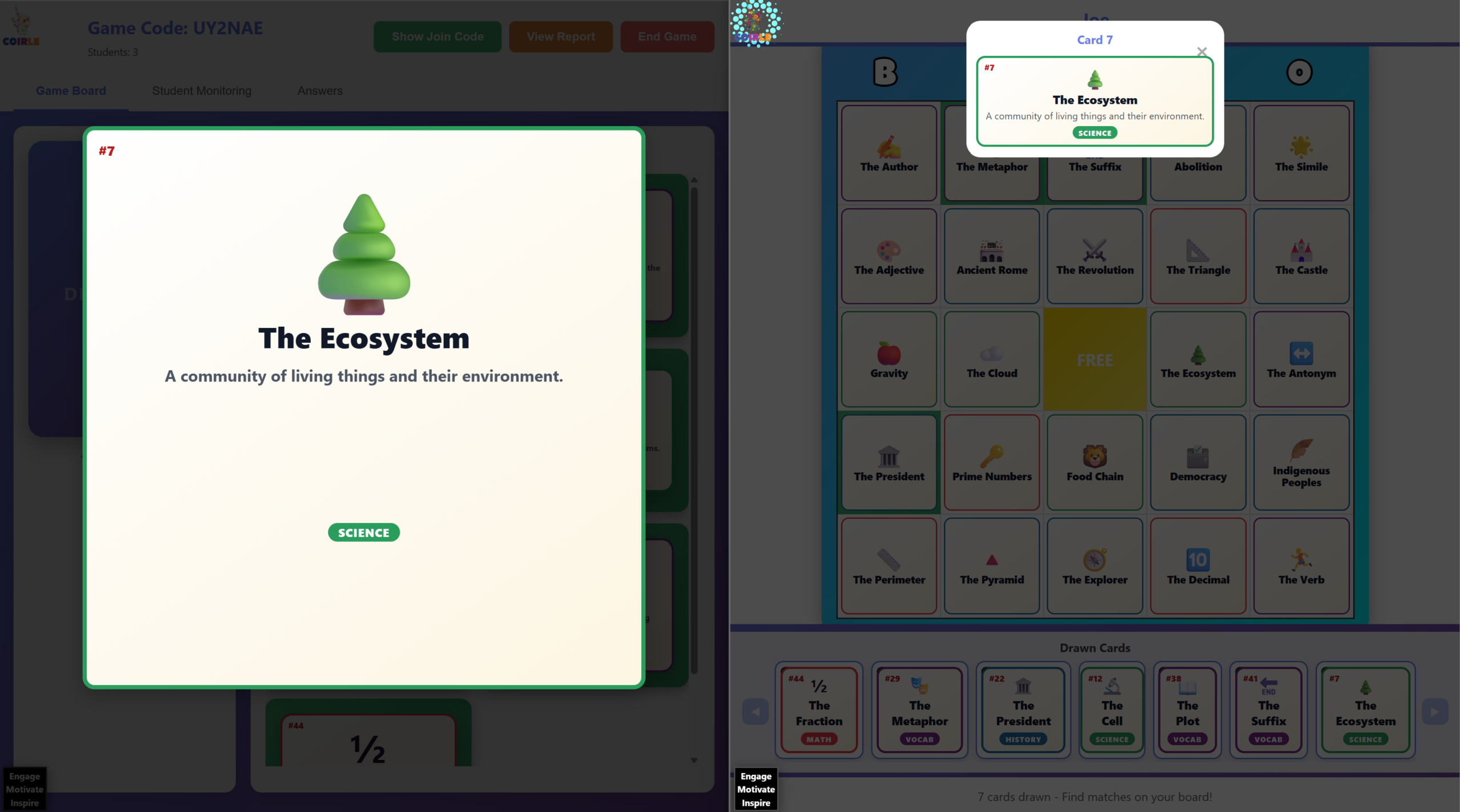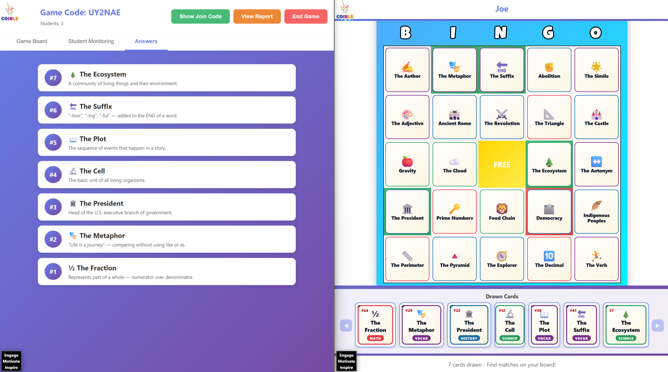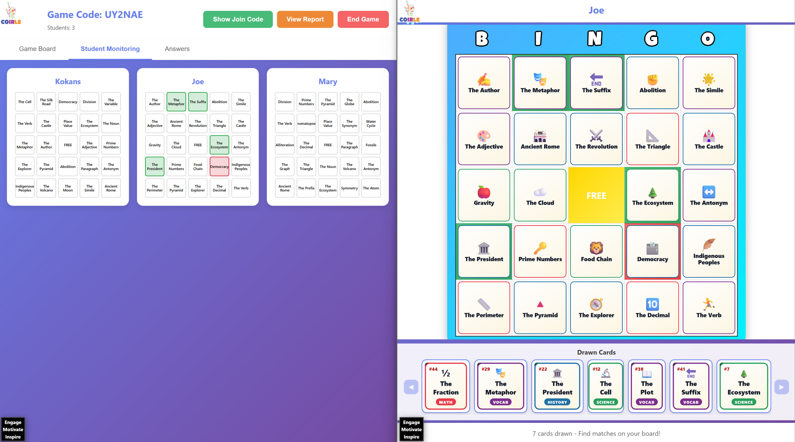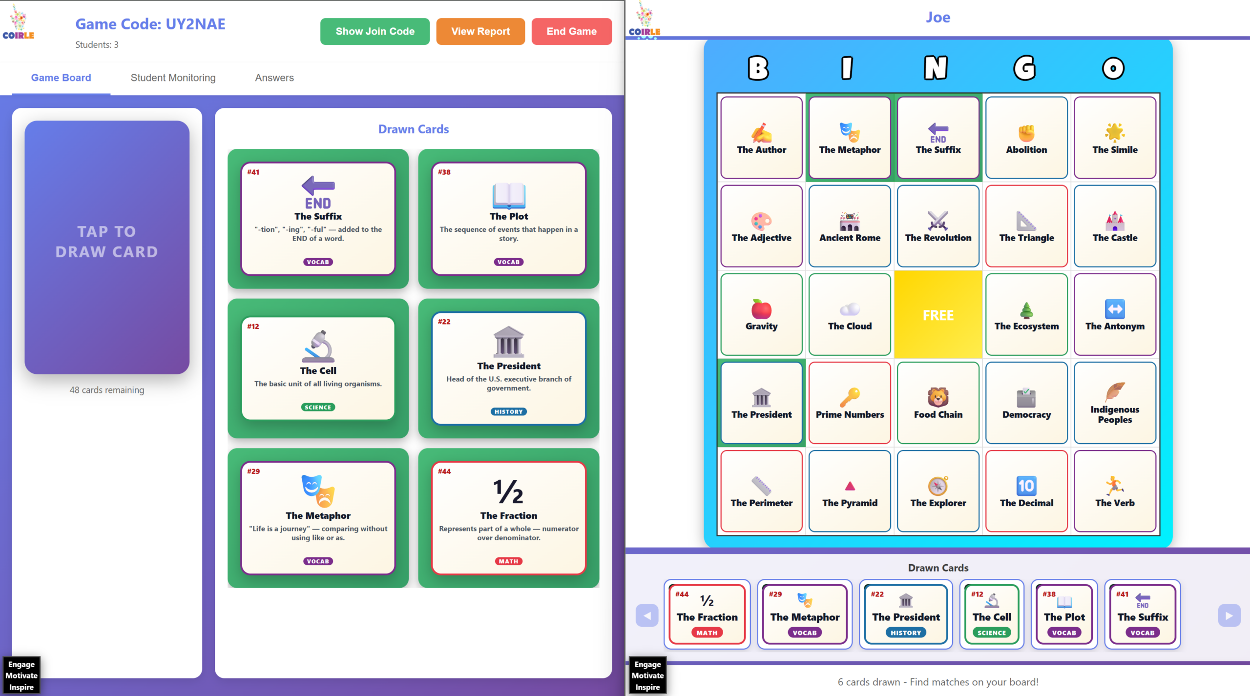 – Students go to: `coirle.com/games/studentbingo/?code=XXXXX`