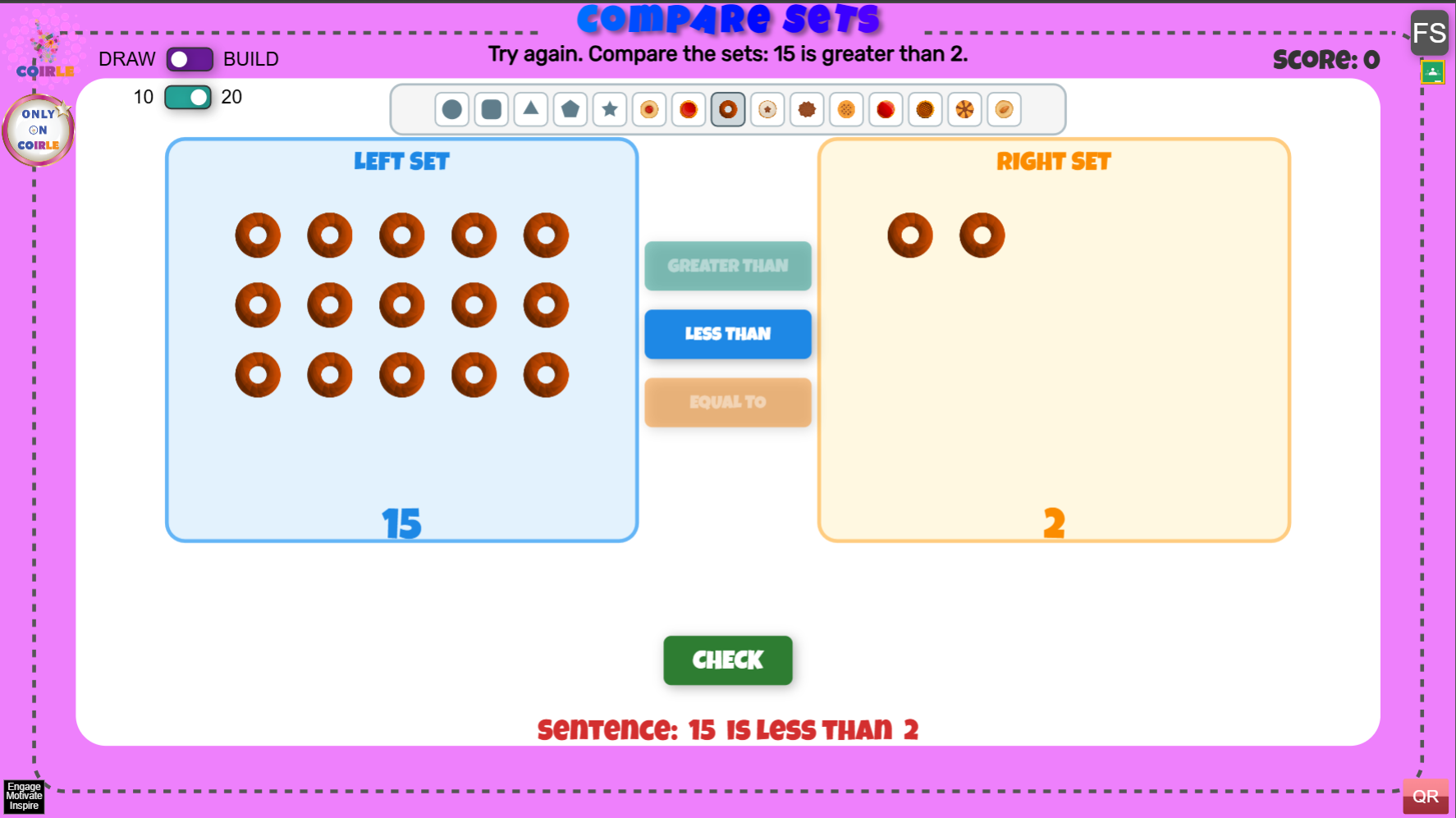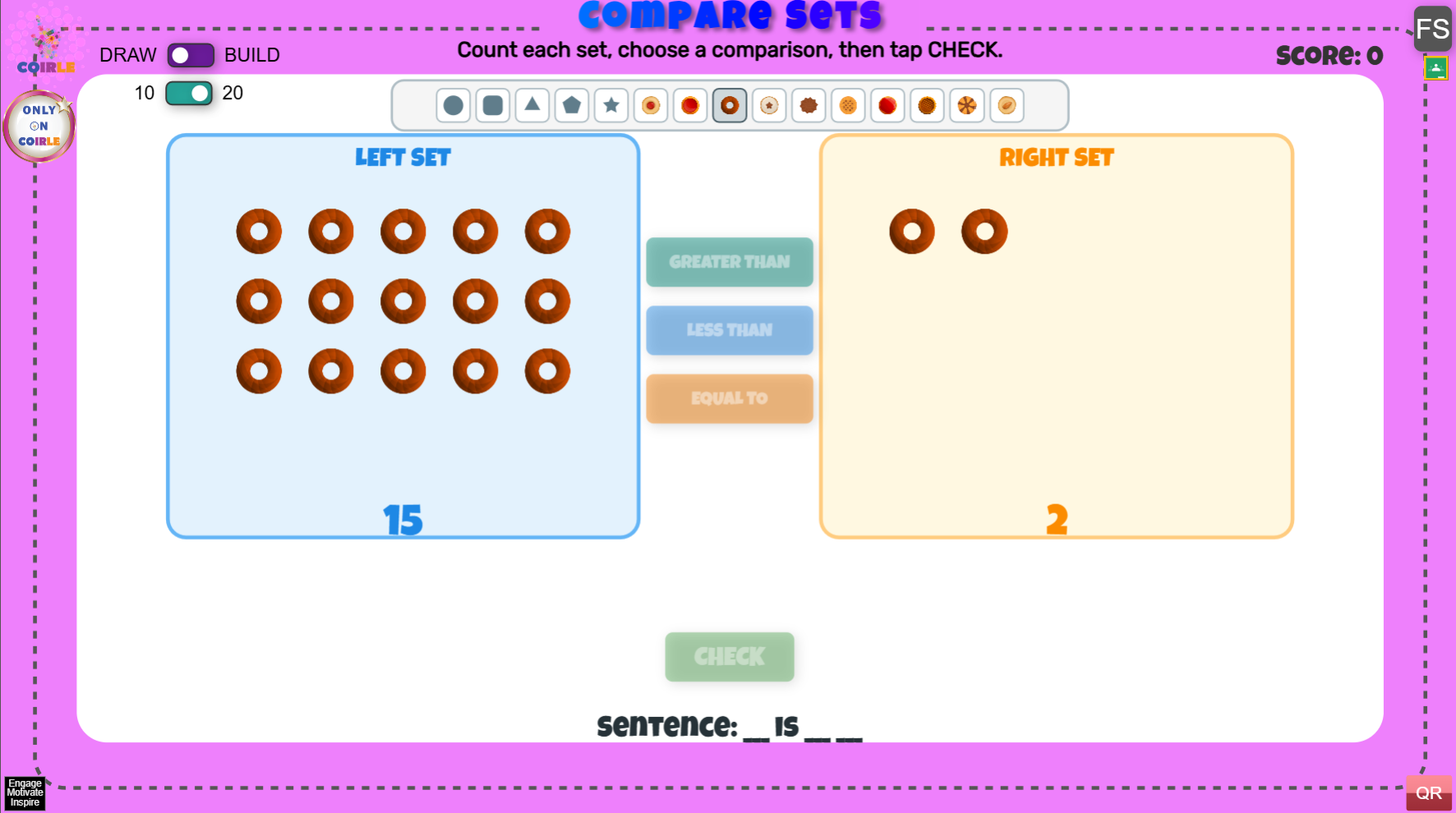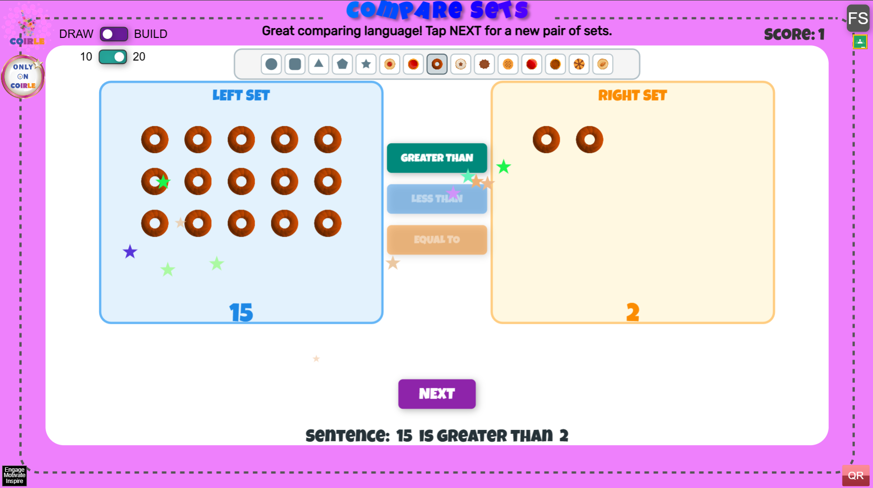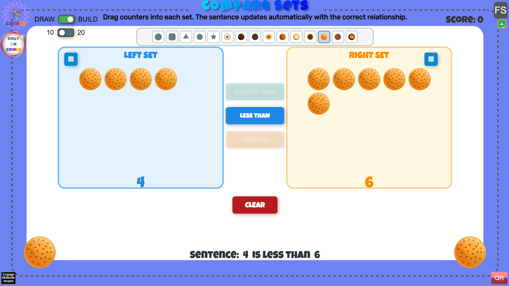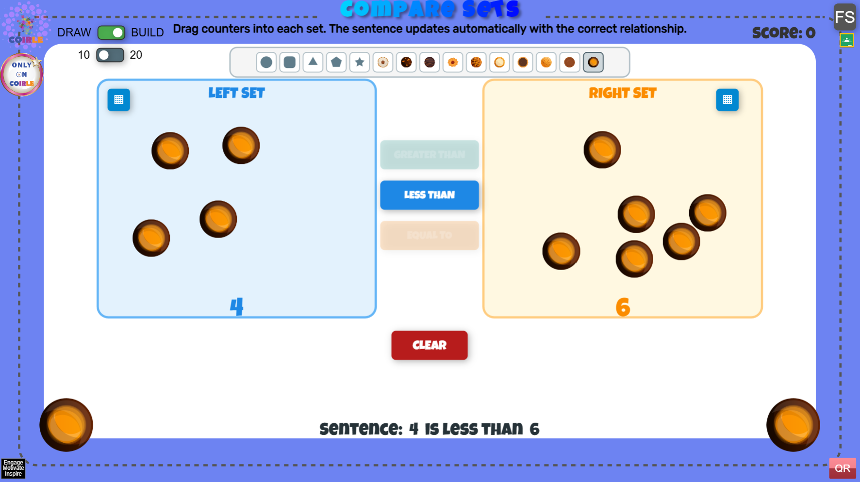 Compare Sets is an interactive math activity where students compare two groups using greater than, less than, and equal to. Learners can play in Draw mode to practice quick visual comparisons or Build mode to drag counters into each set and see the relationship update in real time. Adjustable total limits (10 or 20) make it easy to differentiate for different grade levels.