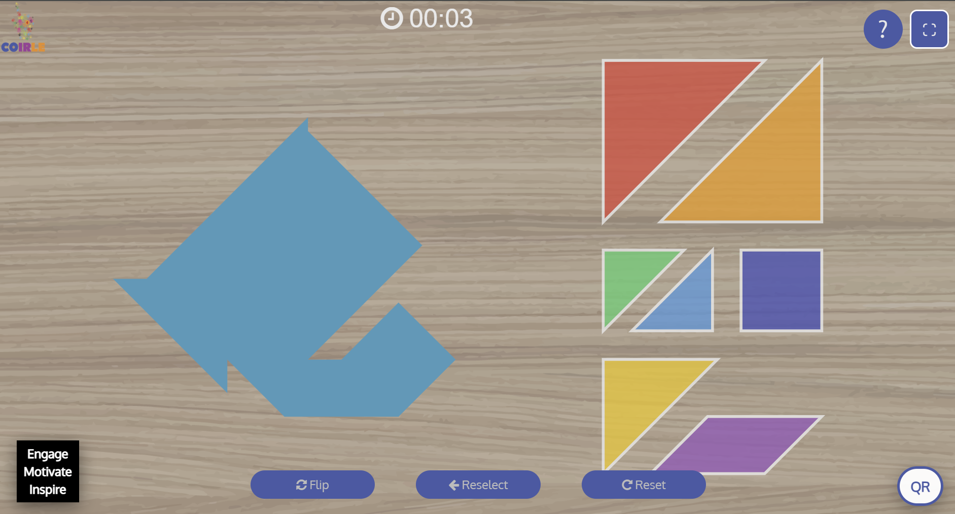 Players choose a silhouette, then rotate, drag, and flip seven geometric pieces to perfectly recreate the target shape. With clean controls, timed gameplay, hint support, and instant puzzle resets, the experience is ideal for classrooms, brain breaks, and independent practice.