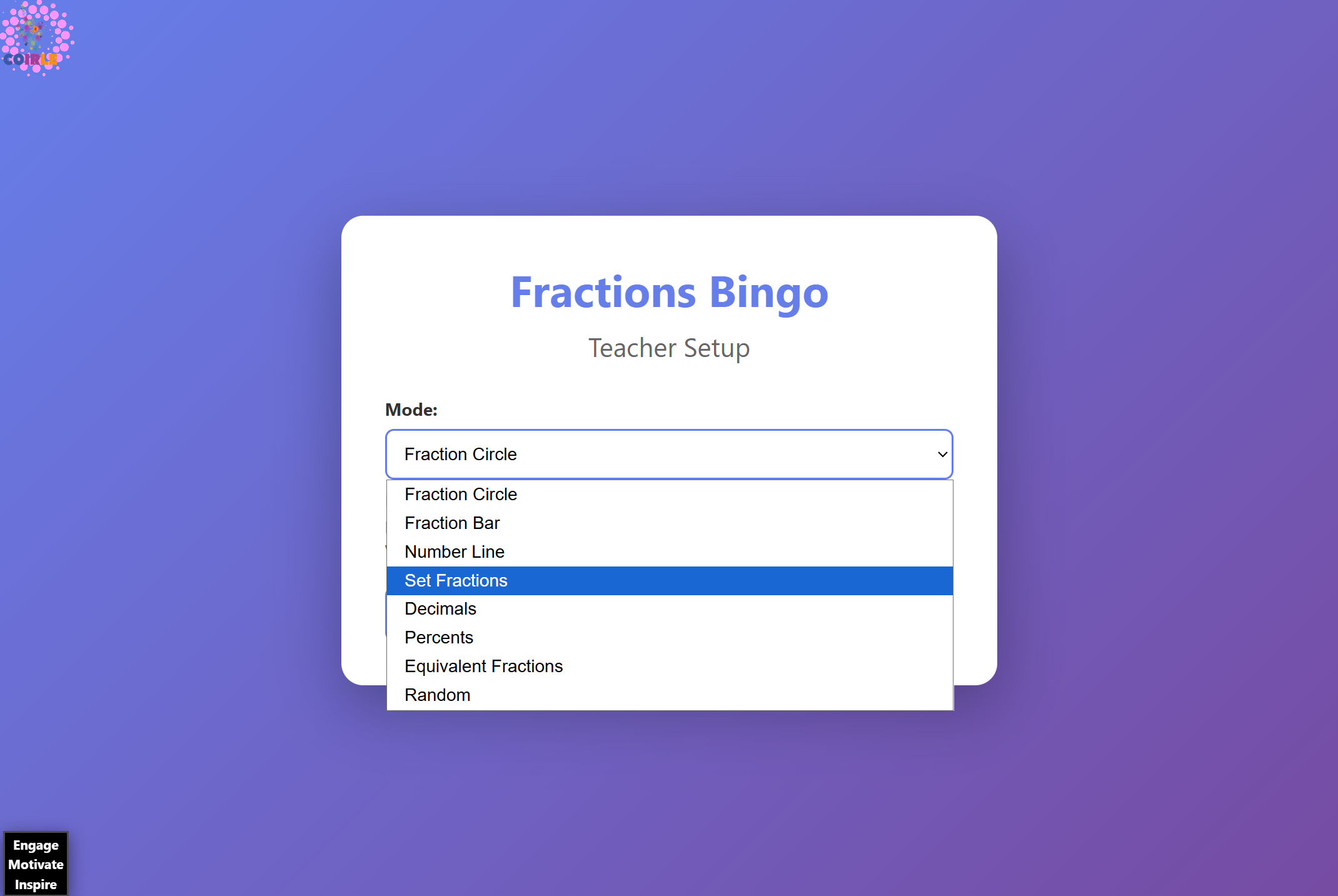 – Students go to: `coirle.com/games/studentbingo/?code=XXXXX`