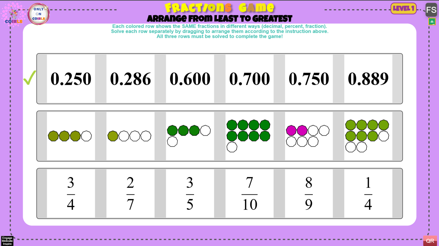 In this game, students will be given three tiles with scrambled fractions in multiple representations. Their task is to arrange all three tiles in the order indicated. The fractions can only be dragged within the tile they are located, horizontally. The three tiles have matching fractions but represented differently. The order will randomly change. After level 5, the tiles will have random representations across the tiles and within the tiles. They will still be ordered but more challenging.