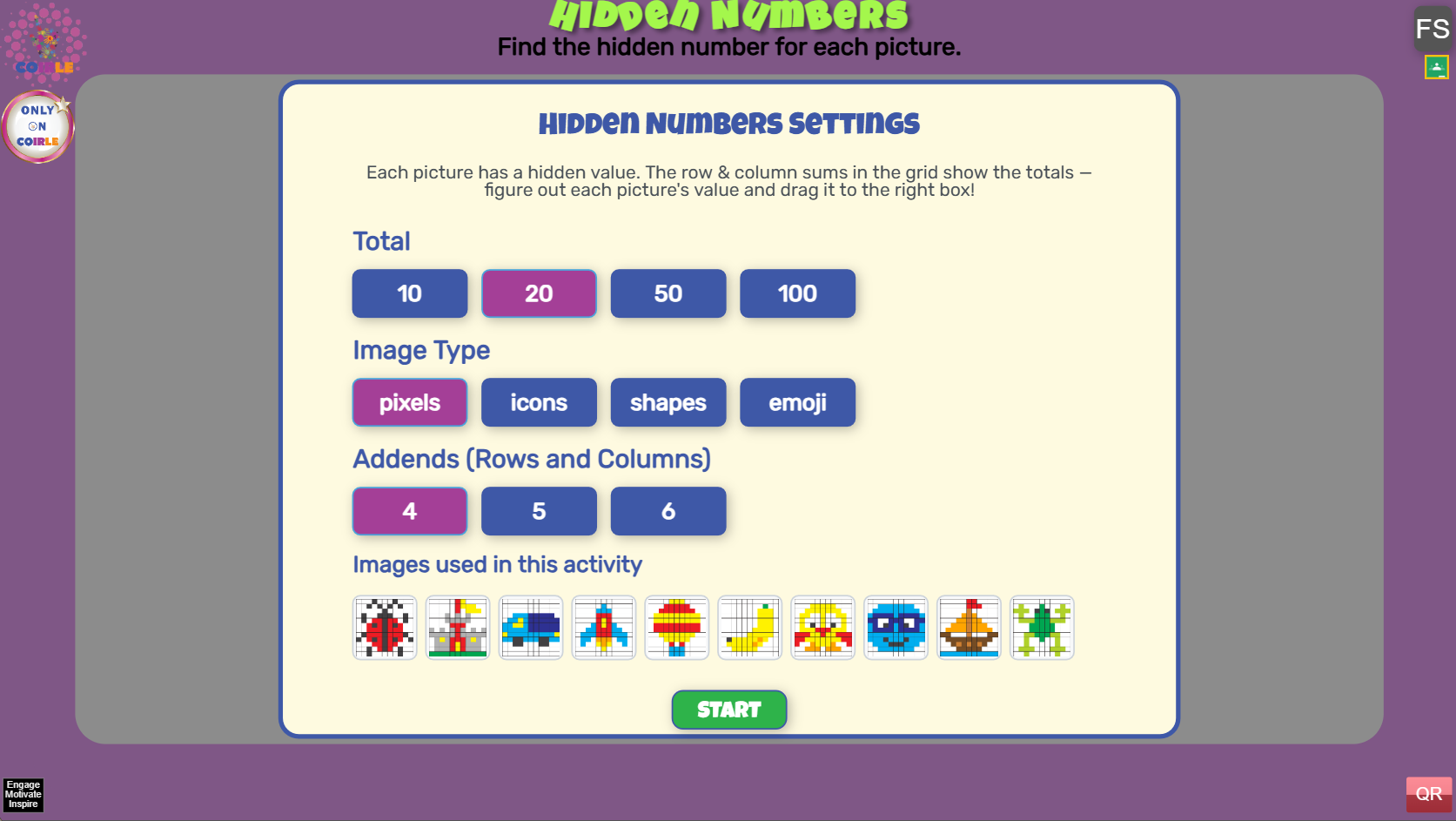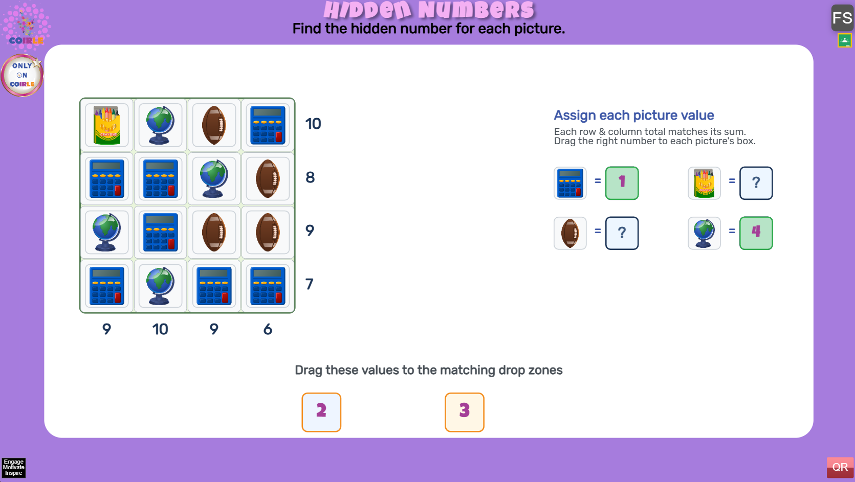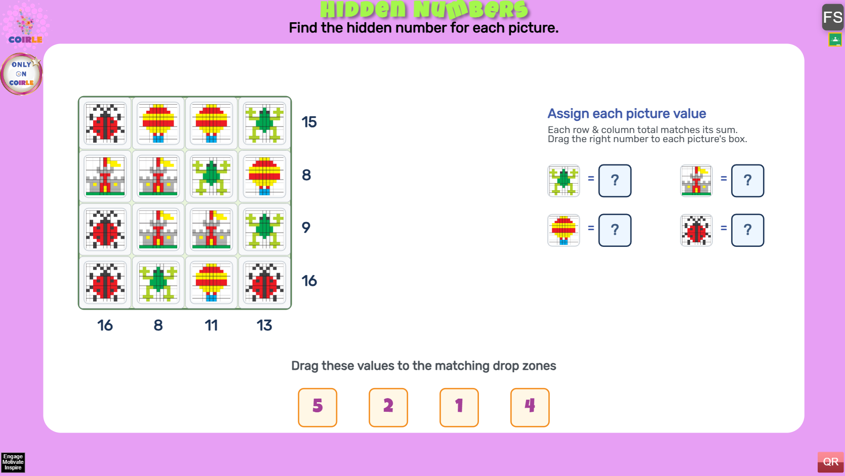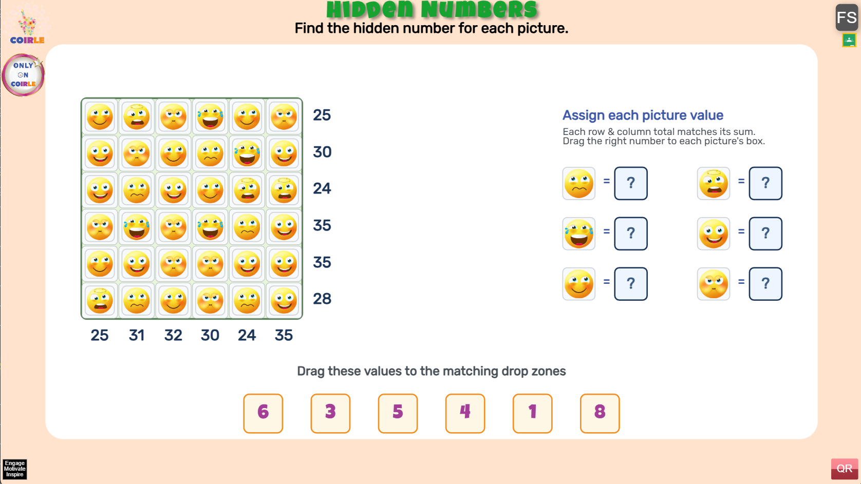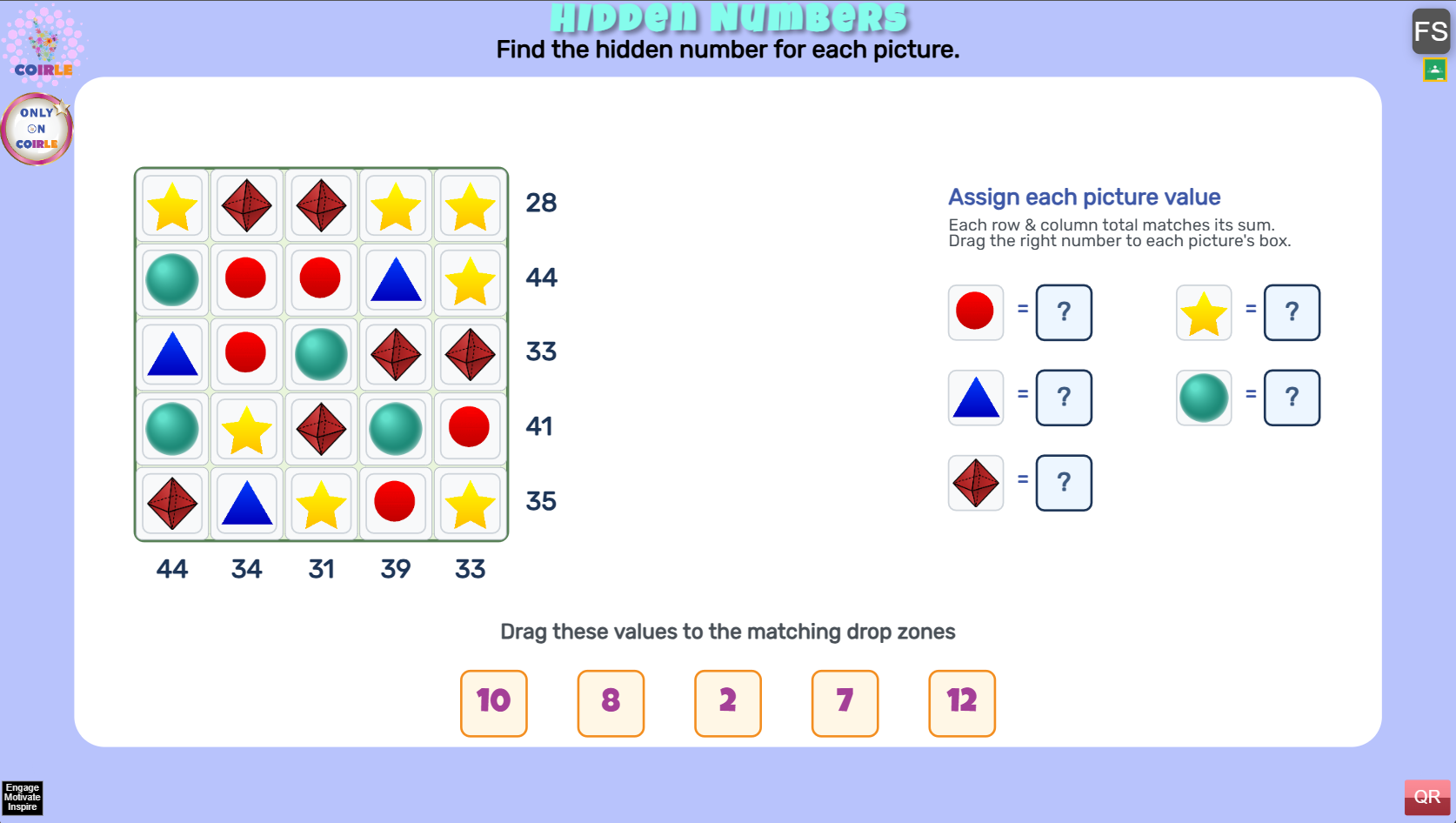 Hidden Numbers is a fast, visual sum puzzle game where every picture stands for a hidden number. Use the row and column totals on the grid to figure out each picture’s value, then drag the correct number into each matching drop box. It blends logic, arithmetic, and pattern recognition in a fun challenge for classroom practice, centers, or independent play.