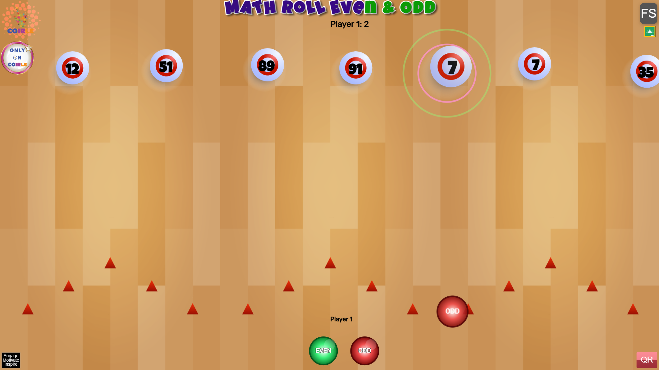Roll your “EVEN” or “ODD” balls at the bouncing number balls above. Hit even numbers with EVEN balls and odd numbers with ODD balls. Each correct hit scores a point; a wrong hit loses a point. First player to 10 points wins!