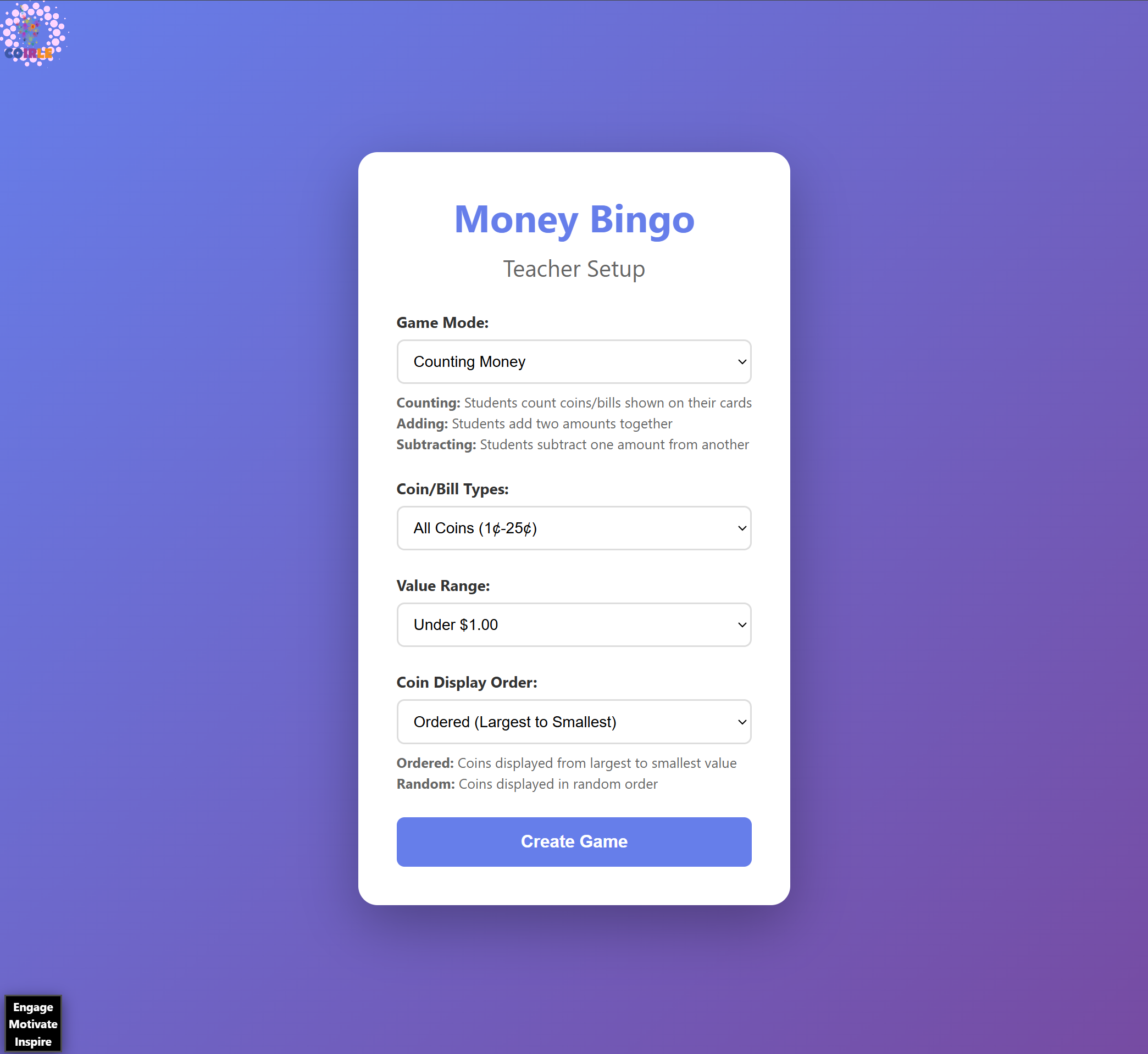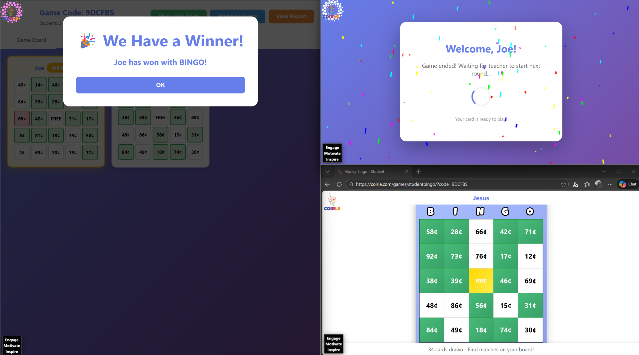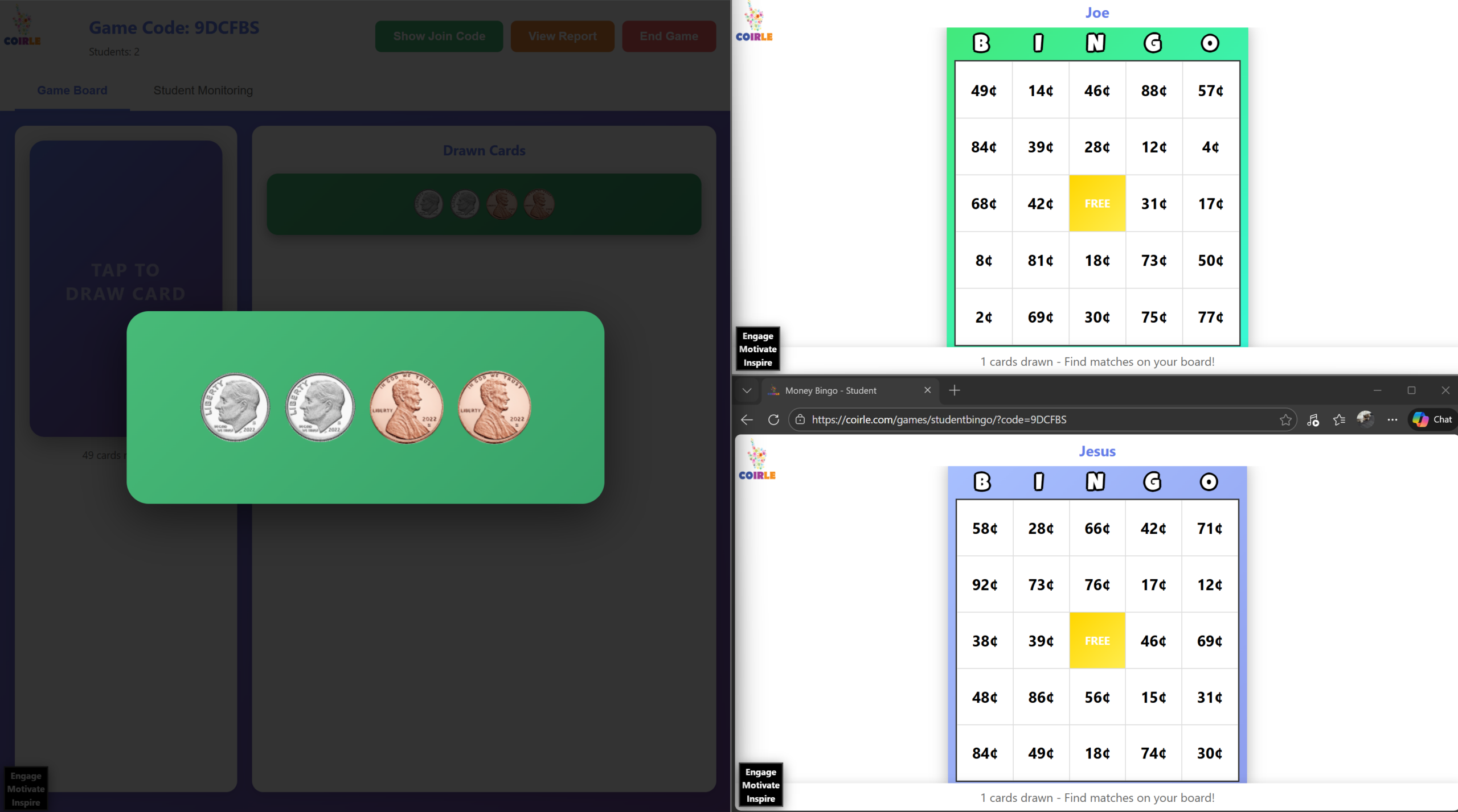 – Students go to: `coirle.com/games/studentbingo/?code=XXXXX`