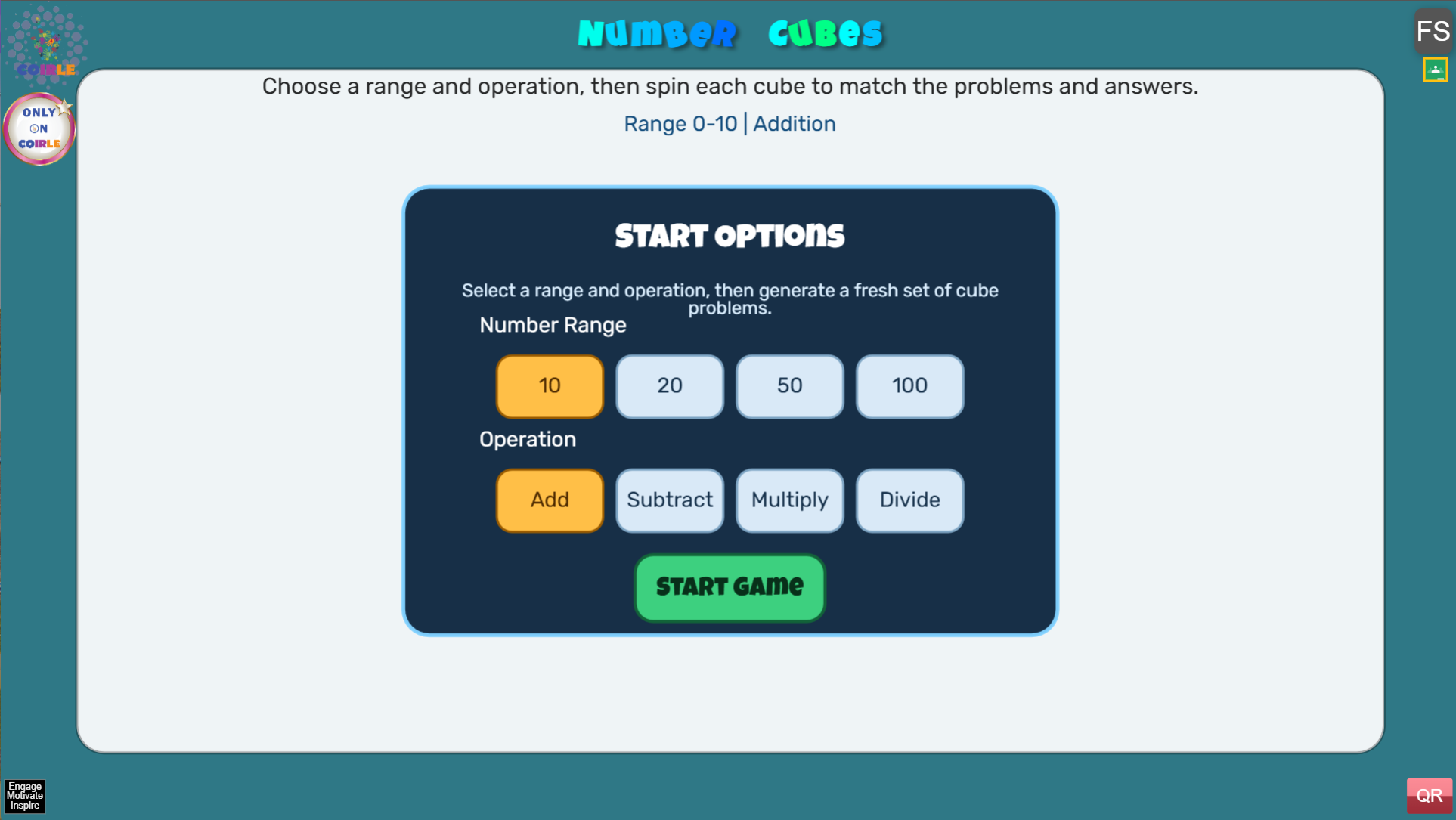 Choose a math operation and number range, then press Start. Each top cube shows math problems and each bottom cube shows possible answers. Drag or swipe the cubes left or right to rotate them and reveal different faces.