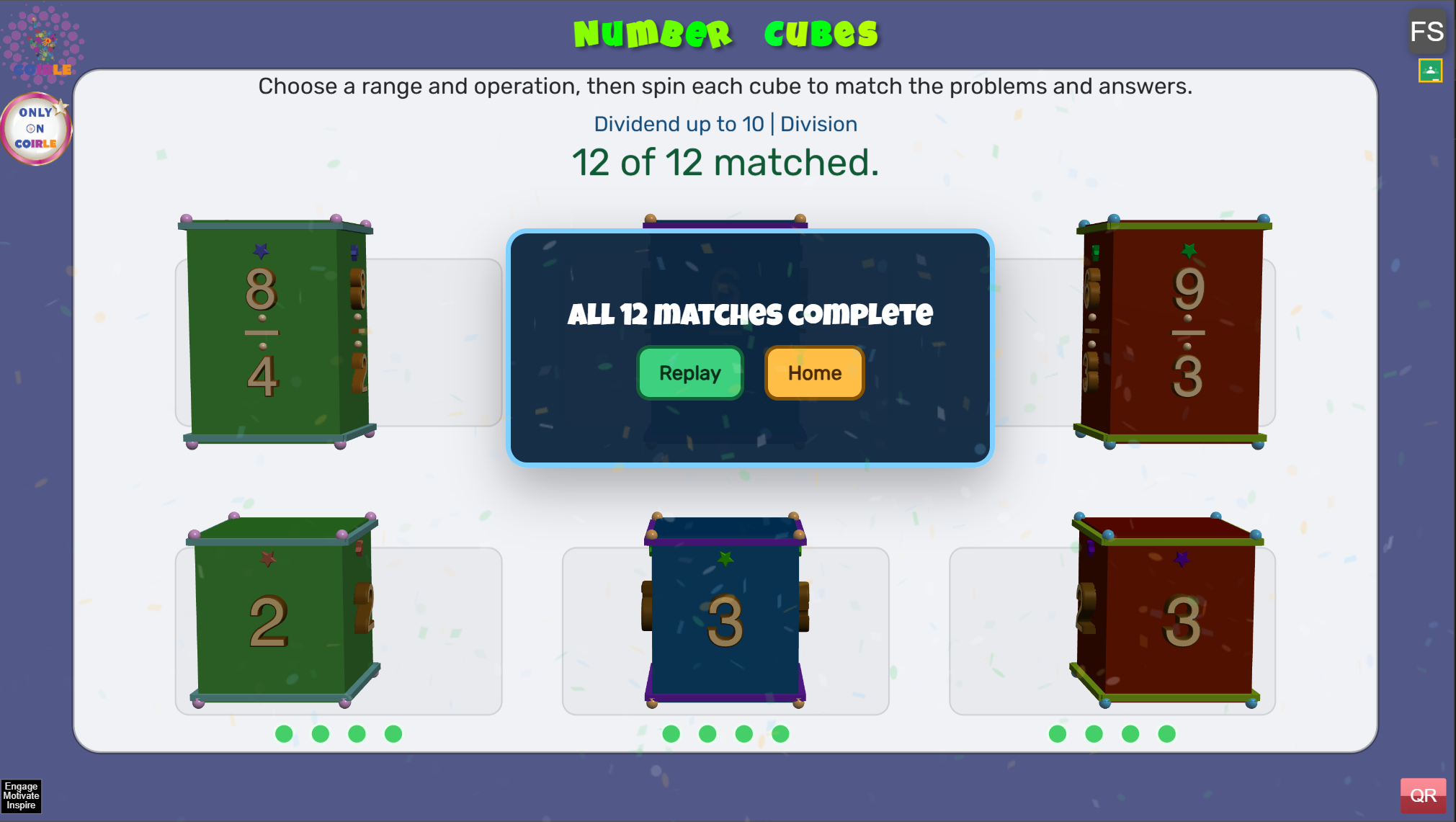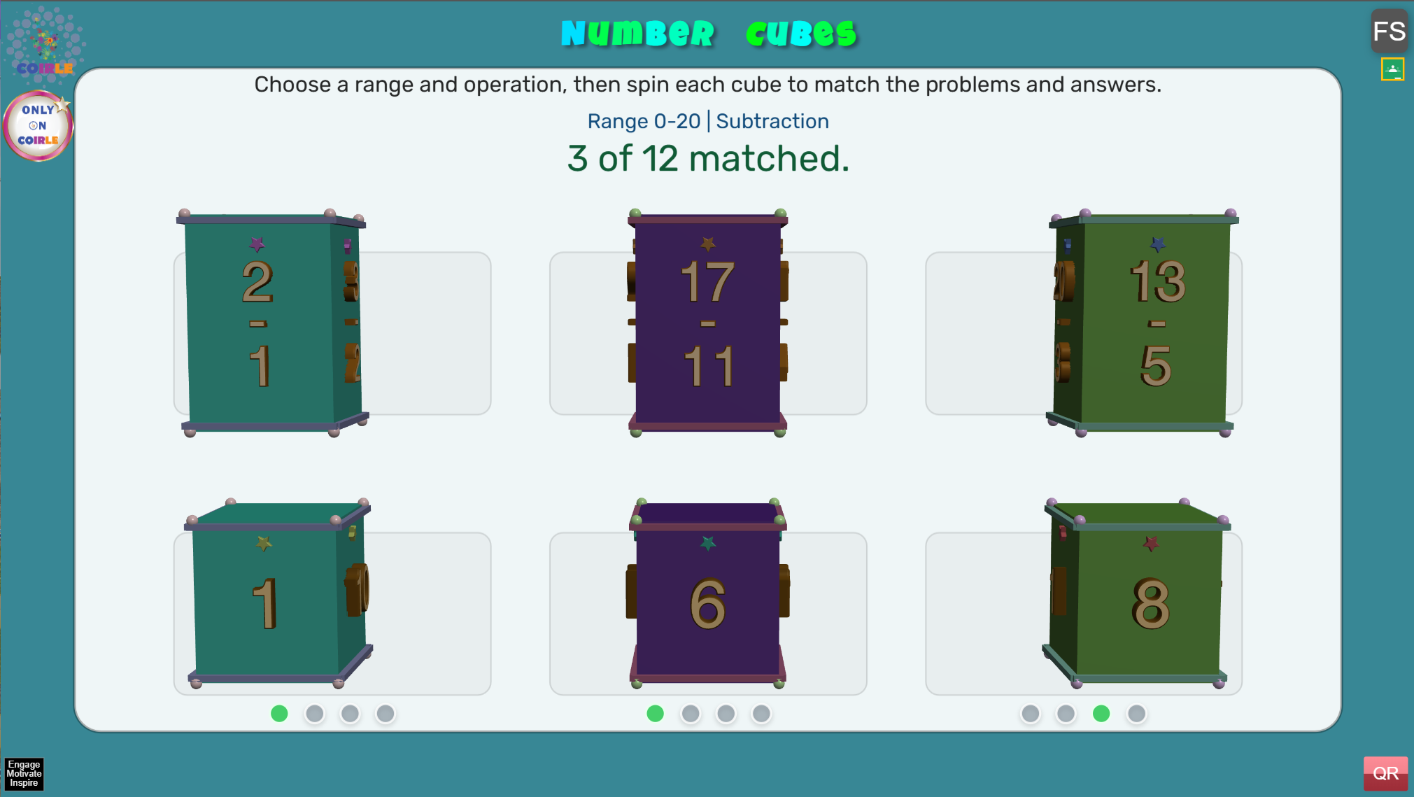Number Cubes is an interactive math matching game that helps students build fluency with addition, subtraction, multiplication, and division. Players rotate colorful 3D cubes to match each math problem on the top row with the correct answer on the bottom row. The game encourages mental math, attention to detail, and repeated practice in a hands-on, game-style format.