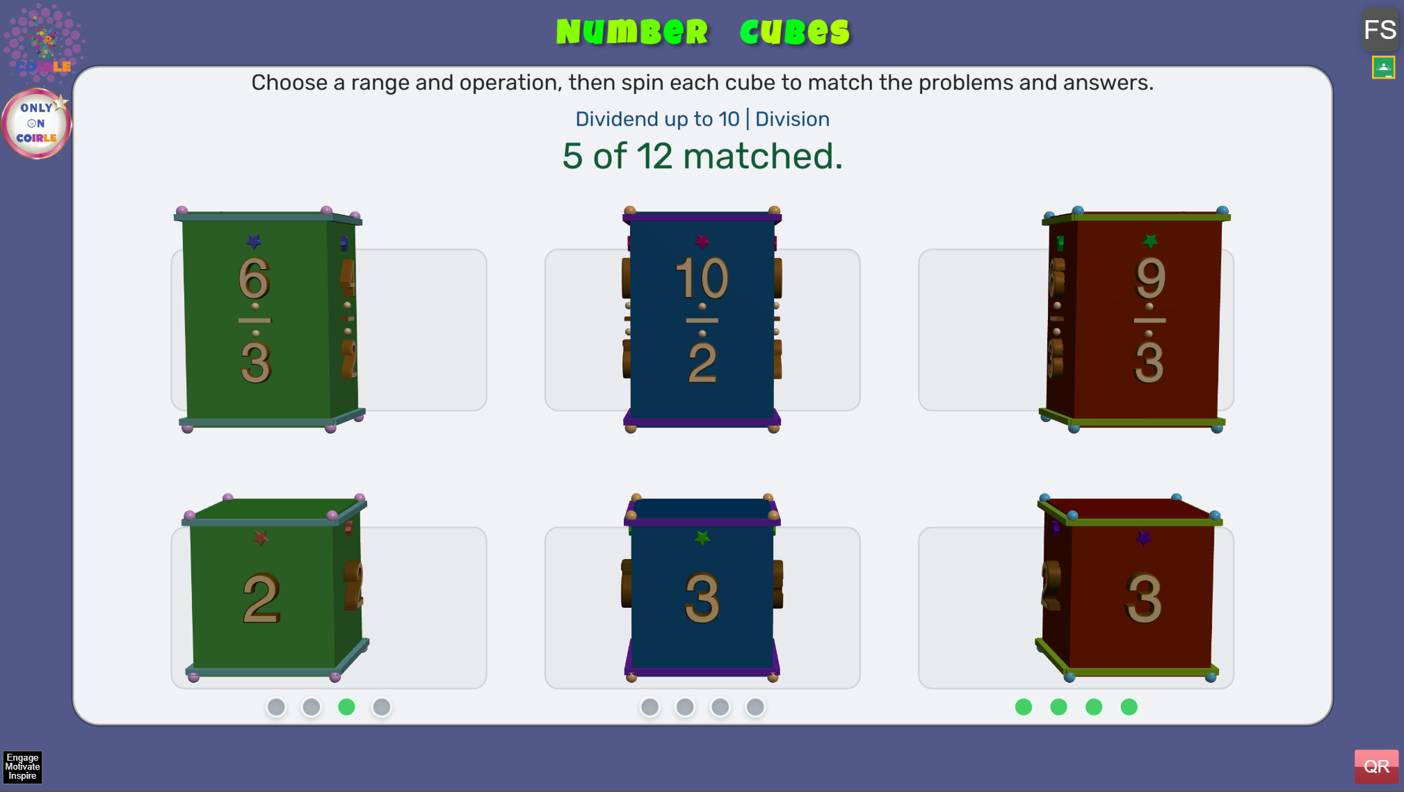 Match each problem with its correct answer by lining up the top and bottom cubes in the same column. When a match is correct, it will be counted in your progress. Continue rotating the cubes until all matches are completed.