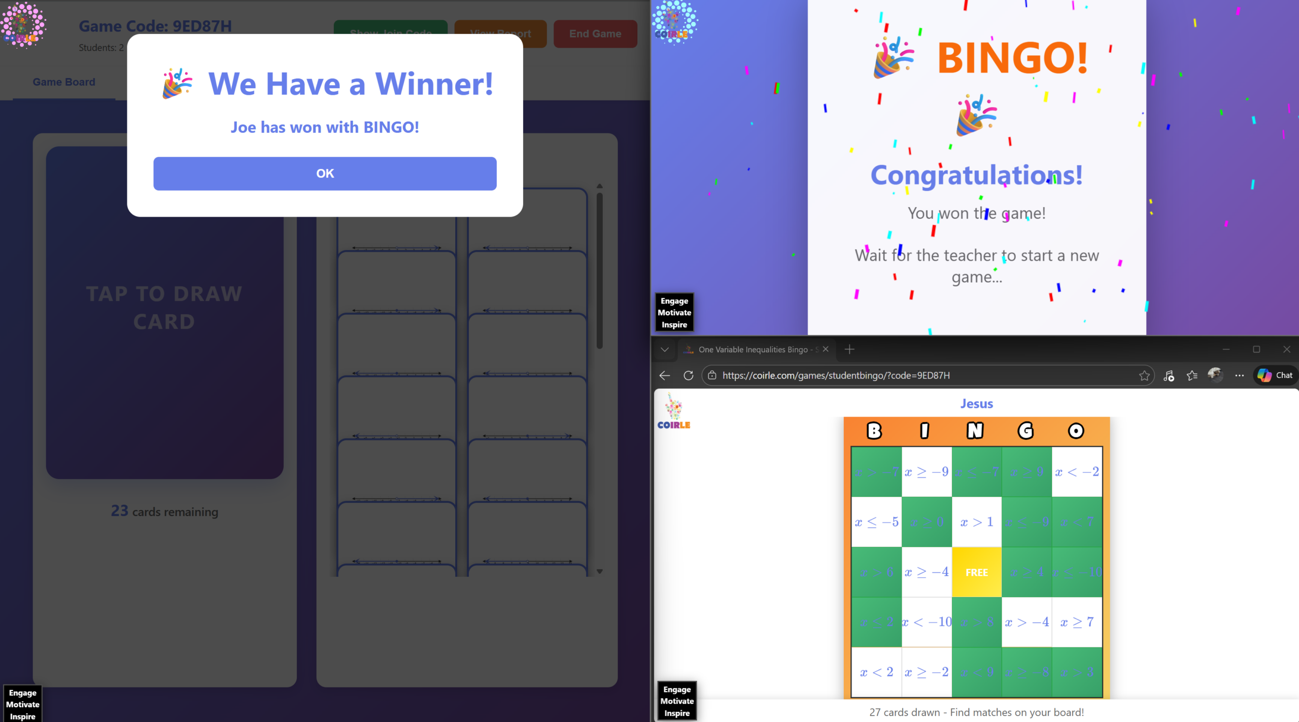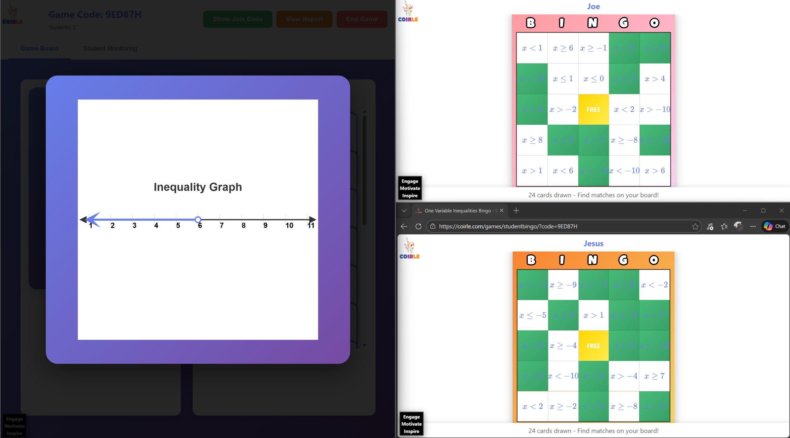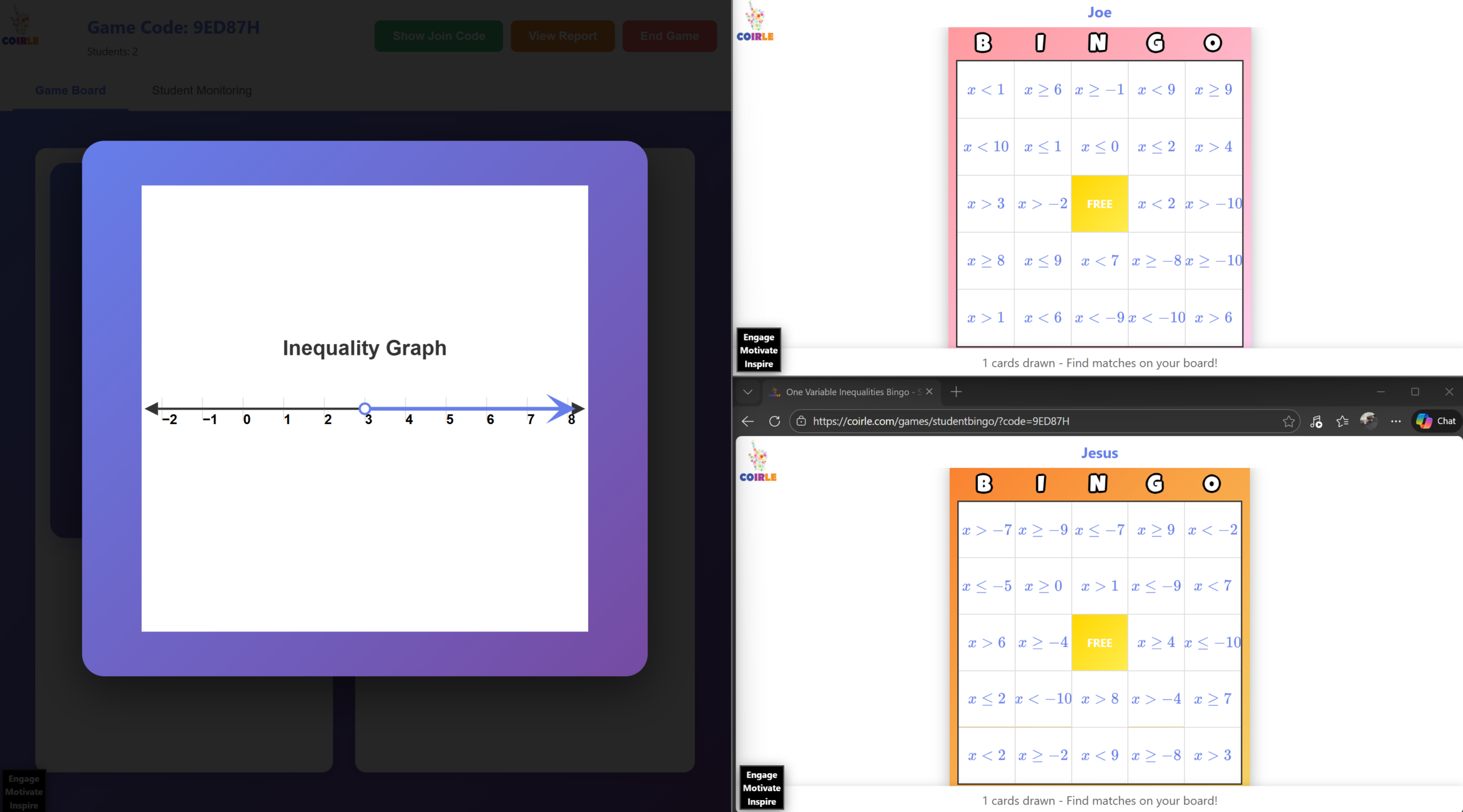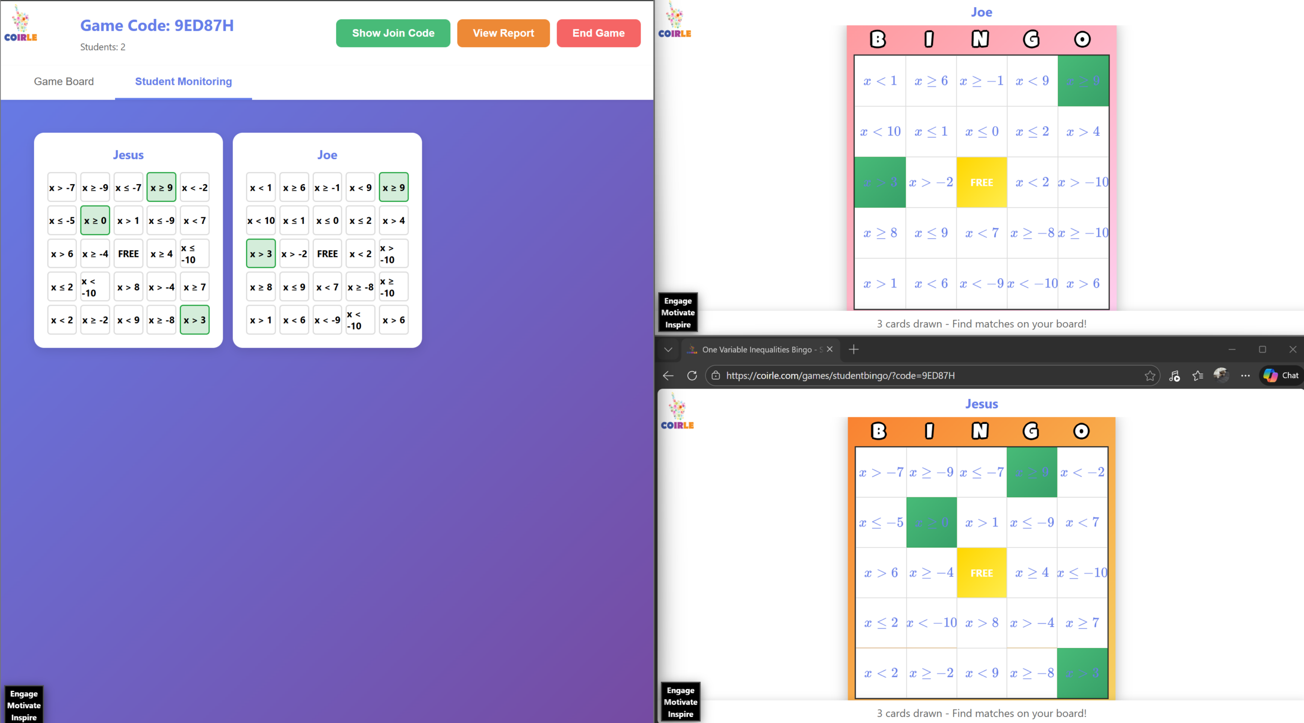 – Students go to: `coirle.com/games/studentbingo/?code=XXXXX`