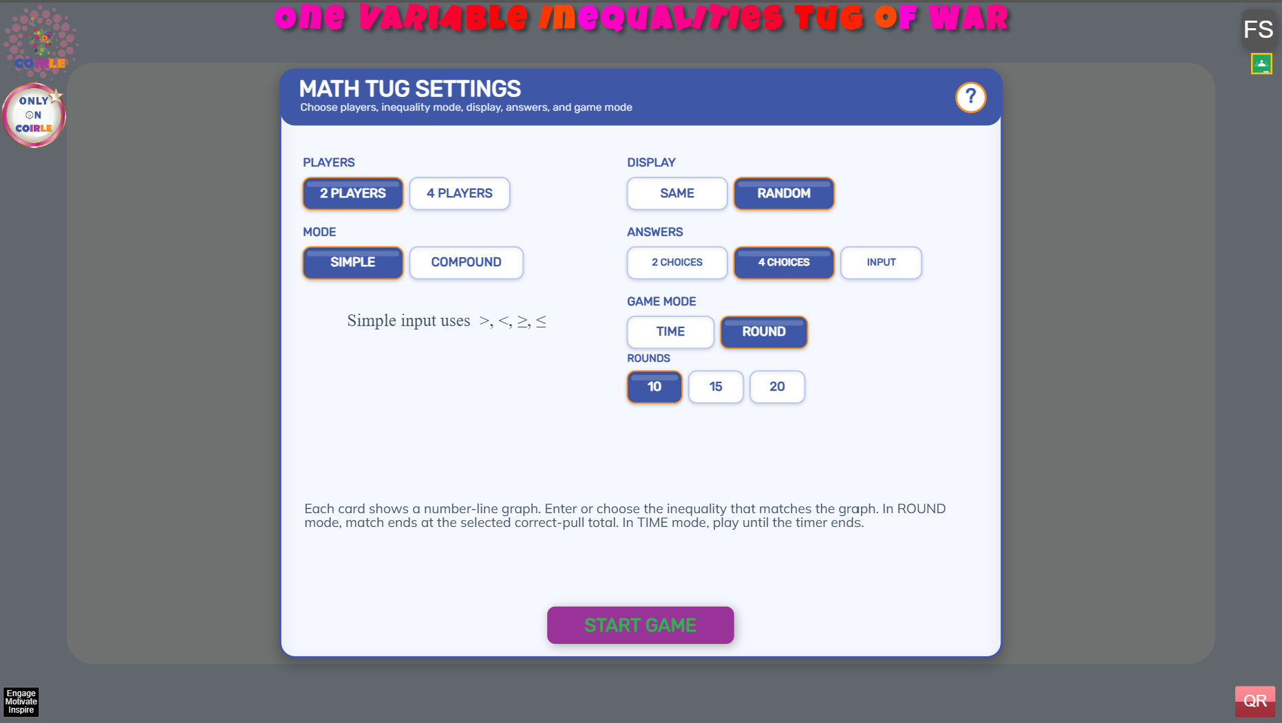 Choose 2-player or 4-player mode, simple or compound inequalities, multiple-choice or input response, and play by timer or by rounds to fit your lesson.