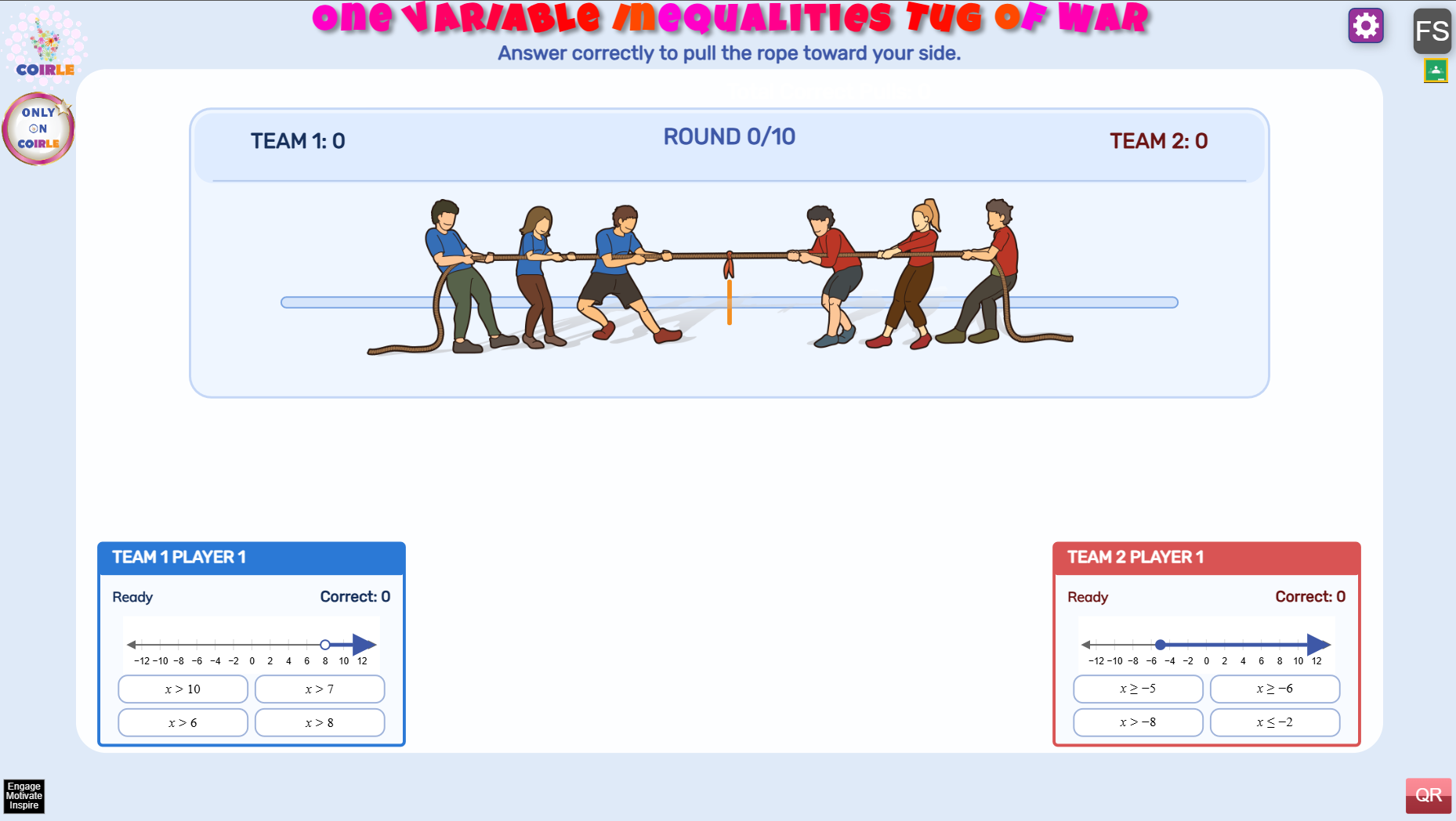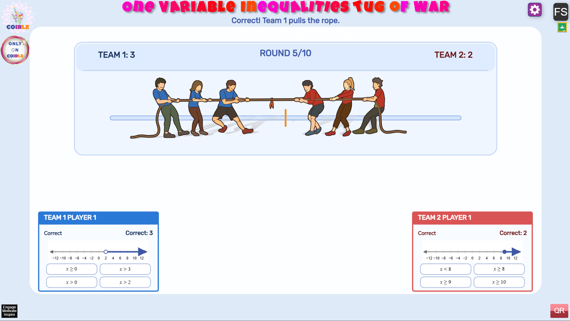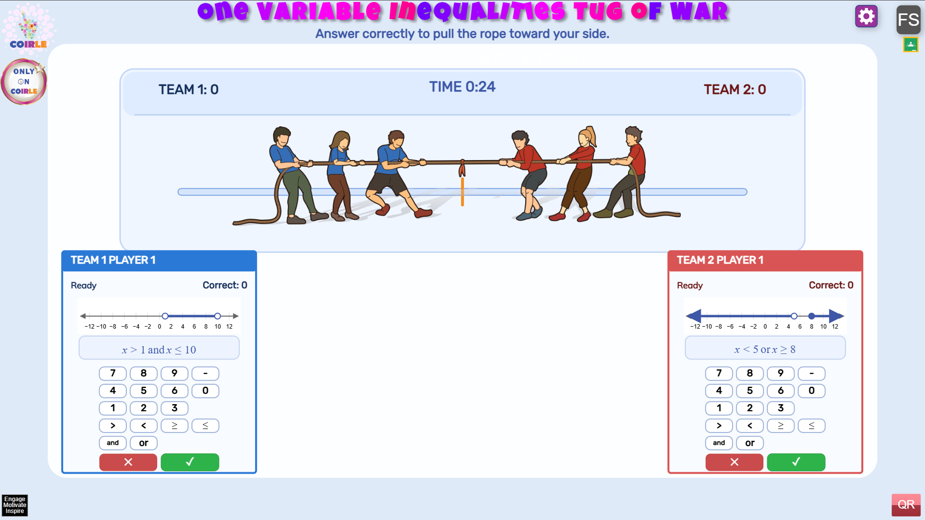 One Variable Inequalities Tug of War is a fast-paced classroom math game where students match number-line graphs to the correct inequality and pull the rope for their team with every right answer.