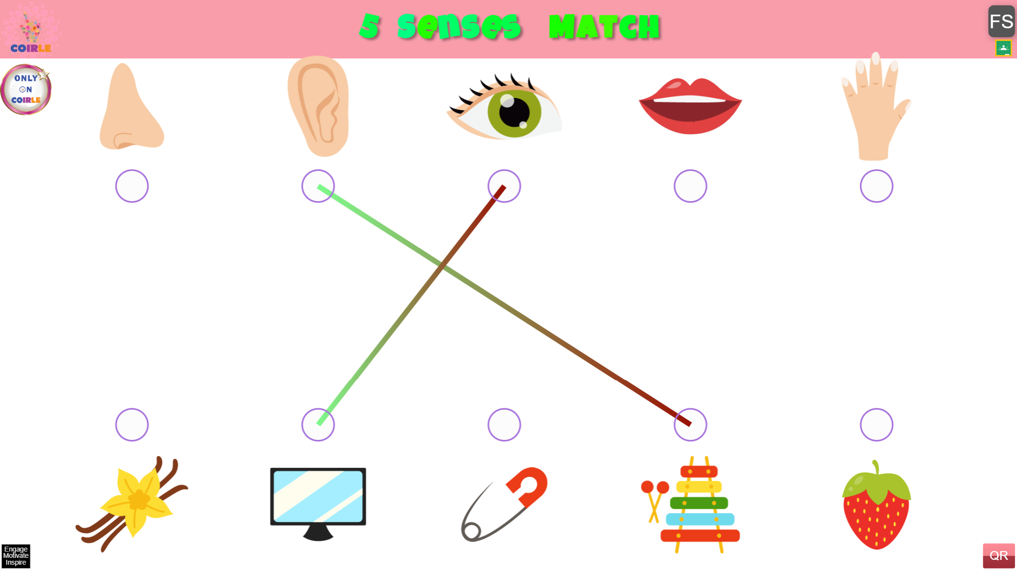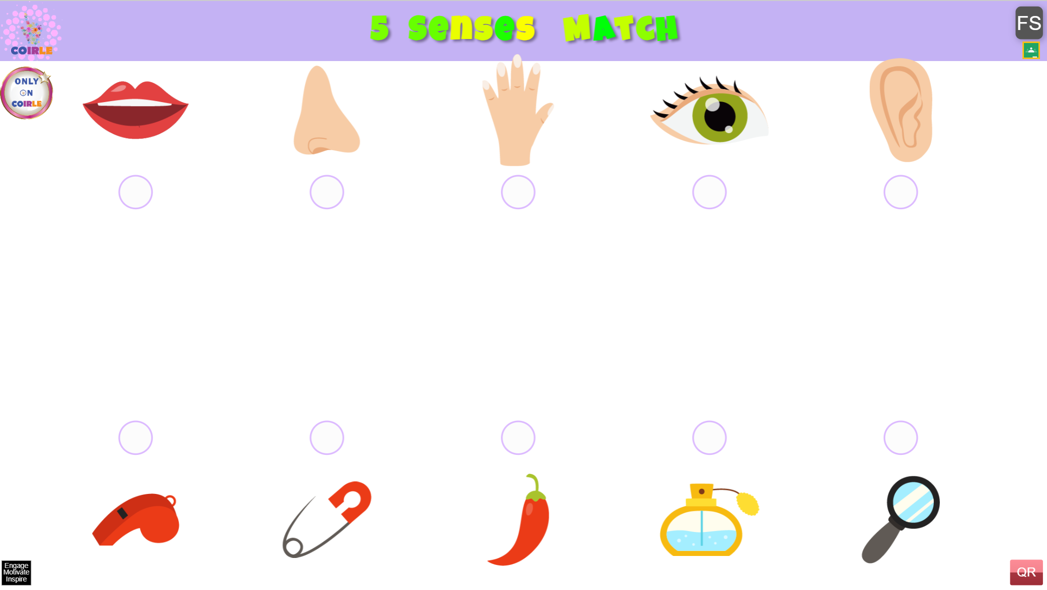 - Five sense icons appear across the top in a random order