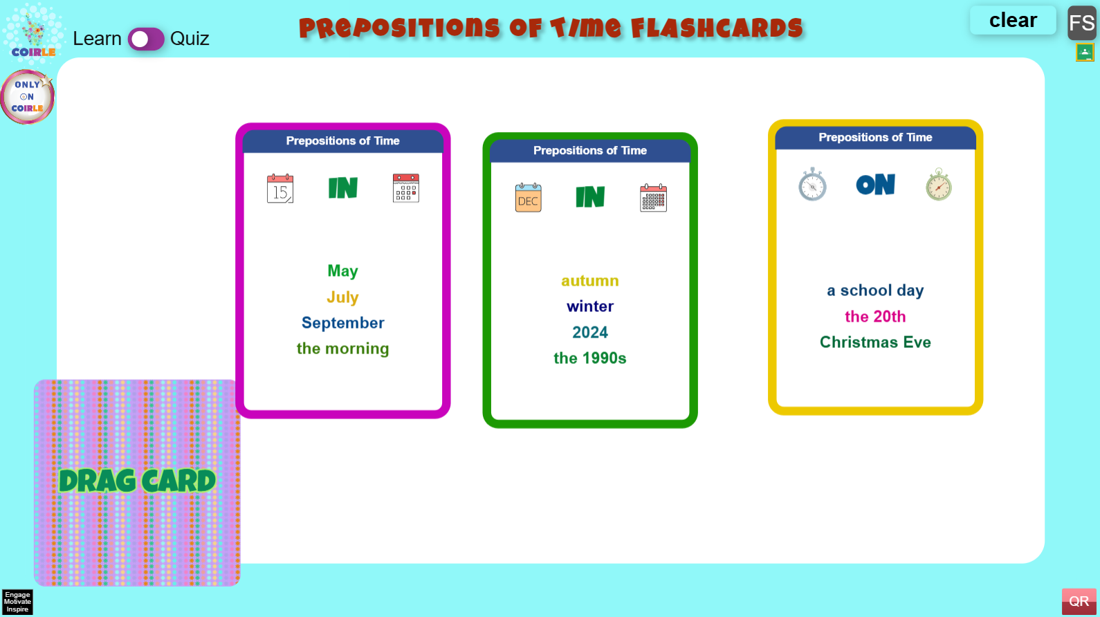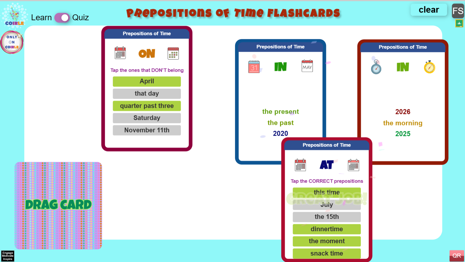 Prepositions of Time Flashcards is an interactive, teacher-friendly language activity that helps students practice in, on, and at through drag-and-create digital cards.